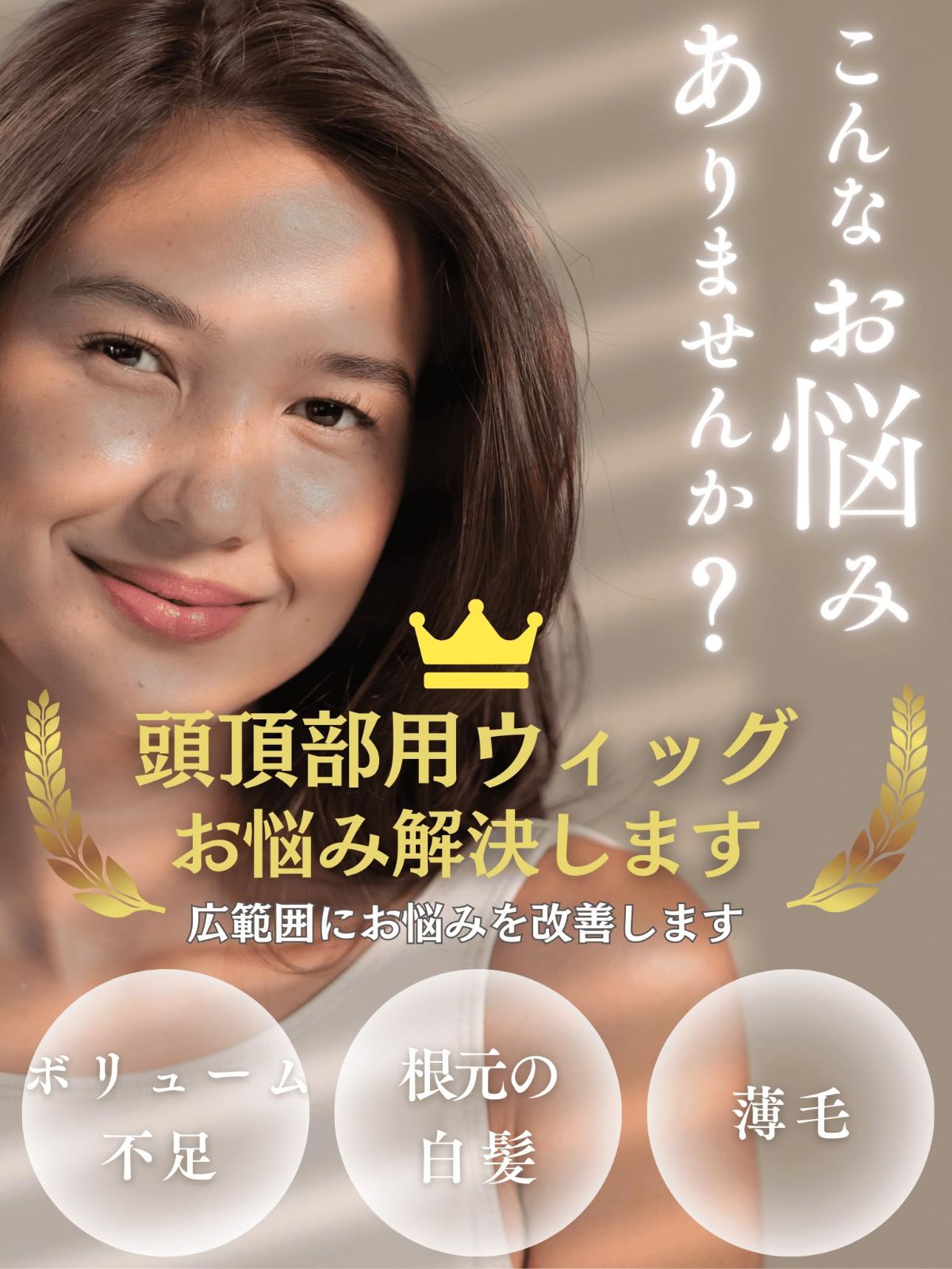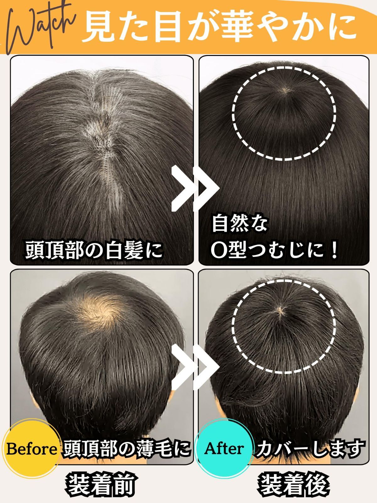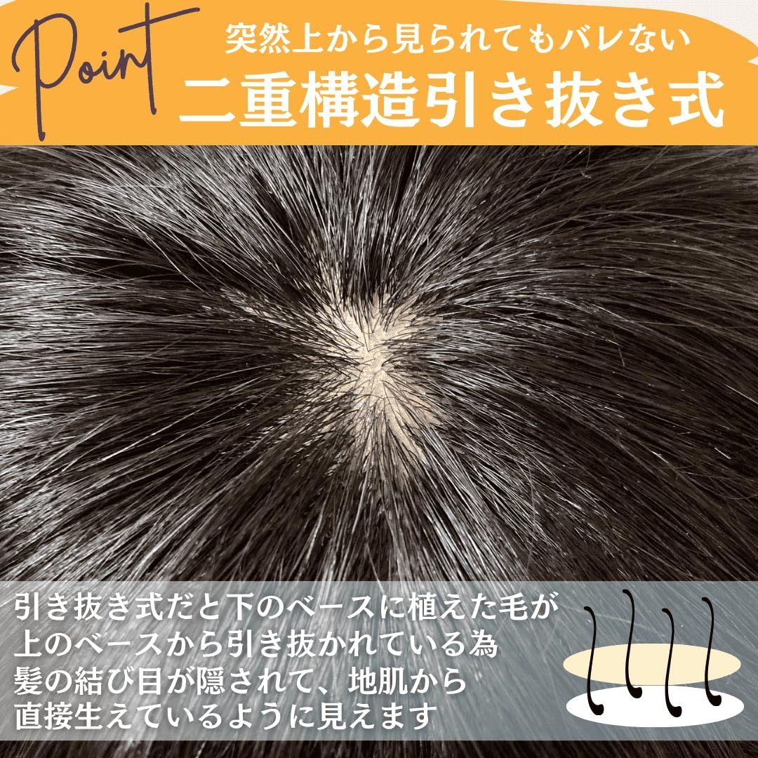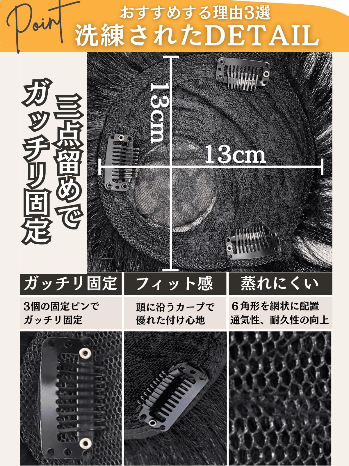 ?【つむじ隠し専用】②特徴:【つむじにヘアプラスmaxi+】はつむじや頭頂部の薄毛や生え際の白髪にお悩みの、ウィッグ、付け毛、カツラ初心者に最適の商品。植毛方法にもこだわり、二重構造&引き抜き式を採用。高級人毛100%の為、ヘアアイロン、ヘアカット、シャンプー、ドライヤー、ヘアカラーも使用可 【通気性UP】ベース: 強力固定ピンは3つで、より自然なつけ心地を再現致しました。広めサイズベースで広範囲の髪のお悩みを改善致します