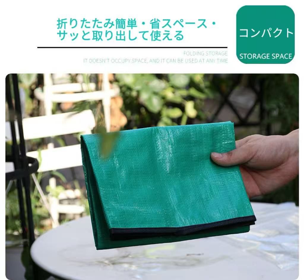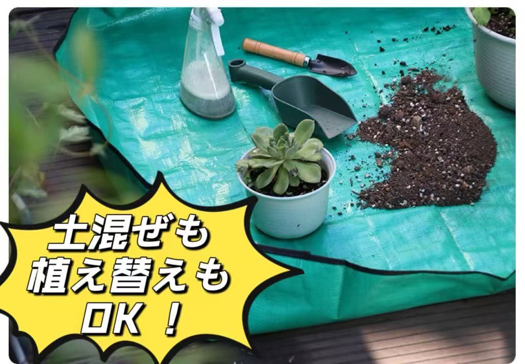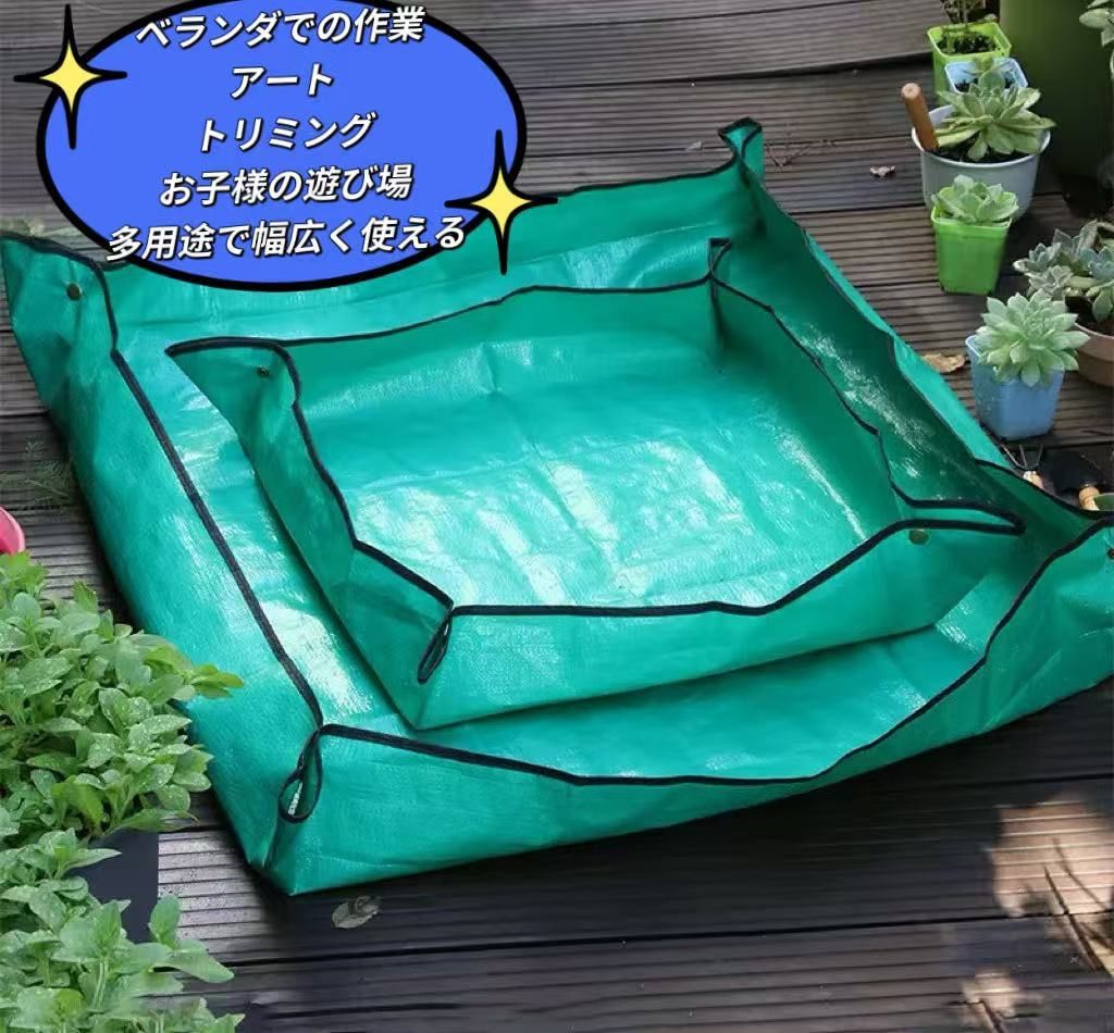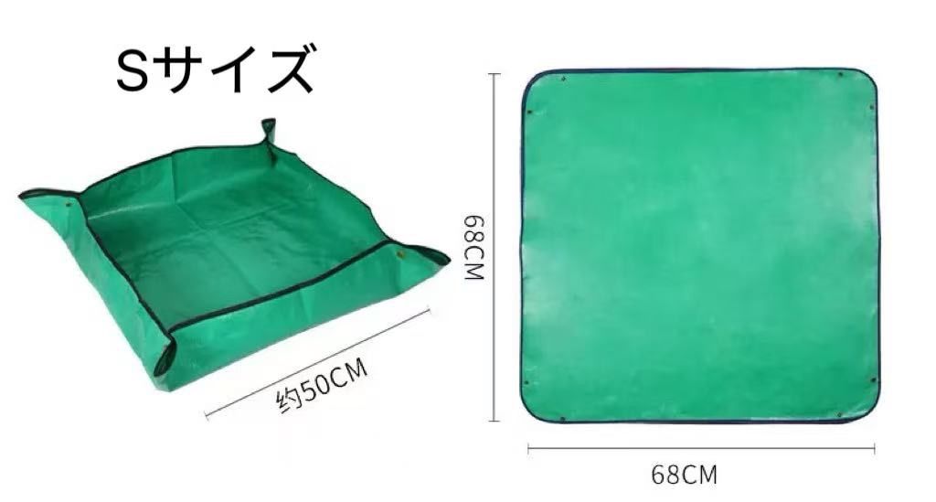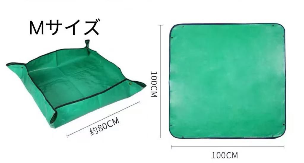 【周りを汚さず洗える防水園芸シート】 植え替えや土混ぜ土運び、何かと周りは汚れるし、新聞とかだと濡れてぐちゃぐちゃになるしで不便ですよね。この園芸シートを使うと、ガーデニング、畑での土混ぜ、肥料混ぜ、土運び、え替え等がとっても便利になります。表面はPE防水塗装で防水性も高く丈夫ですので、取り回しもとてもいいです。使わない時は折りたたむことができ、軽量で持ち運びも収納も楽ちん♪ 【ボタンをぱちんと閉めてすぐ使える】 四隅ボタンをぱちんと留めるだけで箱型になり、土の飛び散り、水がシートから漏れるのを予防してくれます。床や周りを汚さず、快適に作業できます。また、土運びをするときも、足場が悪かったり、一輪車で運びにくい場所でも運べるようになります。 【用途いろいろ】 ペットのトリミング、ベランダでの作業、お子様の遊び場、アートなどでもご使用できます。工夫次第で、用途の幅は無限大です。 【商品詳細】 Sサイズ(別ページで販売しております):66cm×66cm(作業スペース:44x44cm) Mサイズ:99cm×99cm(作業スペース:79x79cm) ※個体差で、誤差がある場合がございますので、ご了承ください。また、生産時期等により、表面の質感が異なる場合がございますが、ご使用の機能には問題ありません。 ※日本語取扱説明書、撮影用小物類などは付属しておりません。 ※簡易包装でのお届けとなります。 ※モニターにより色合いが若干違いが生じる場合がございます。 ※デザインは入荷時期により若干変化する場合がございます ※海外製造品のため、多少の匂い軽微な傷や汚れ、個体差等ある場合がございます。 ※商品の使用により生じた如何なる損害・被害も弊社では一切の 責任を負いかねますので予めご了承ください。 ※発送方法について:お届け先、個数によって配送情報に記載の配送業者とは異なる場合がございます。日本郵便、または佐川急便(配送方法はご指定頂けません)でお届けいたします。