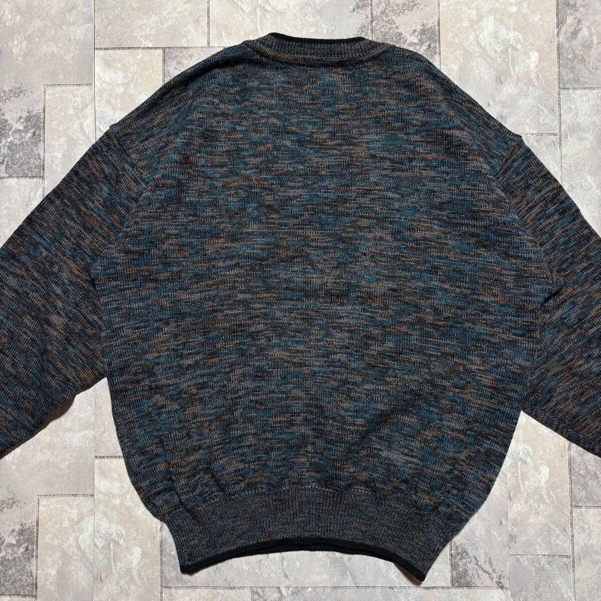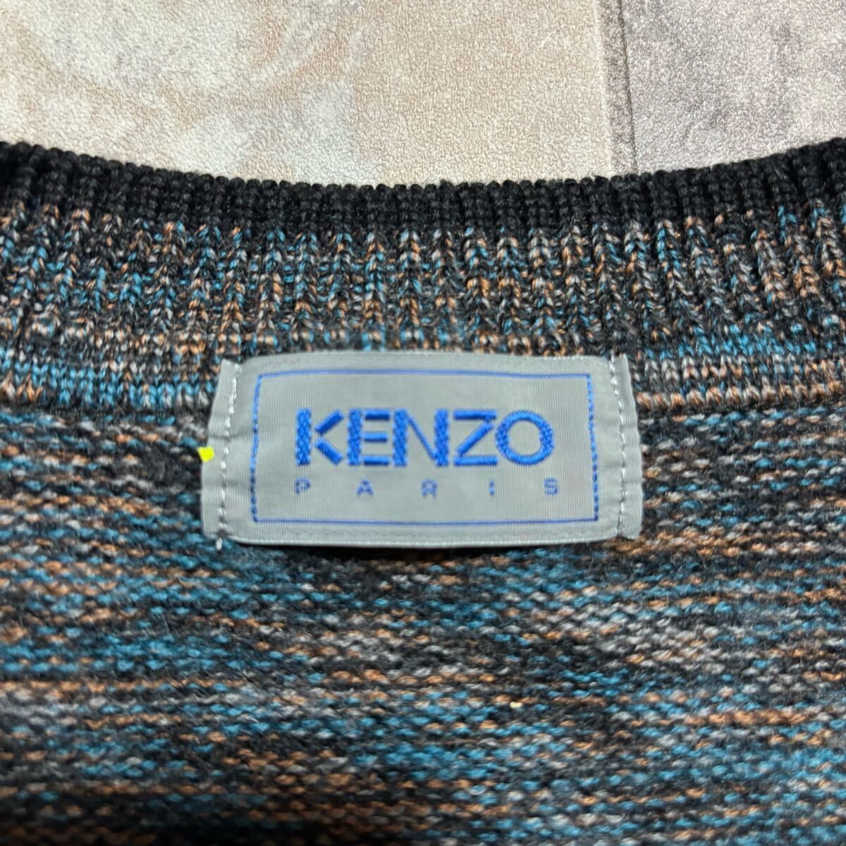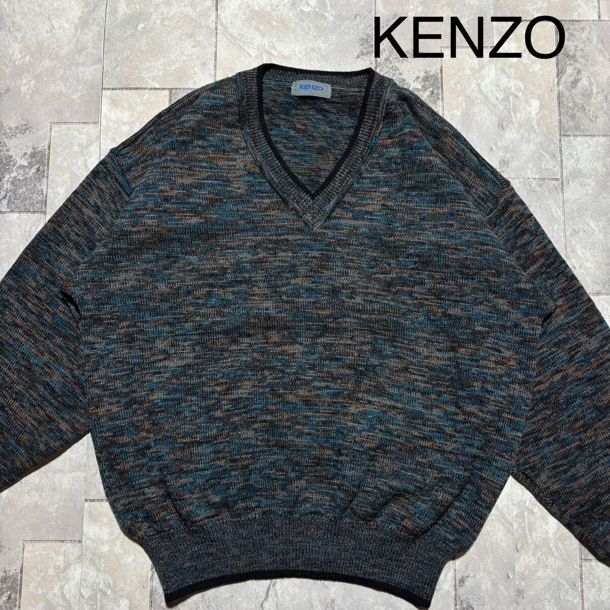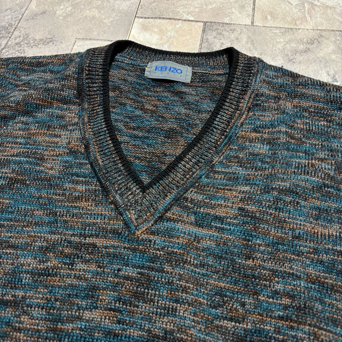 KENZO PARIS ケンゾー ニット セーター Vネック 日本製 総柄 ウール 長袖 ブルー ブラック ブラウン サイズL相当 玉FS1756