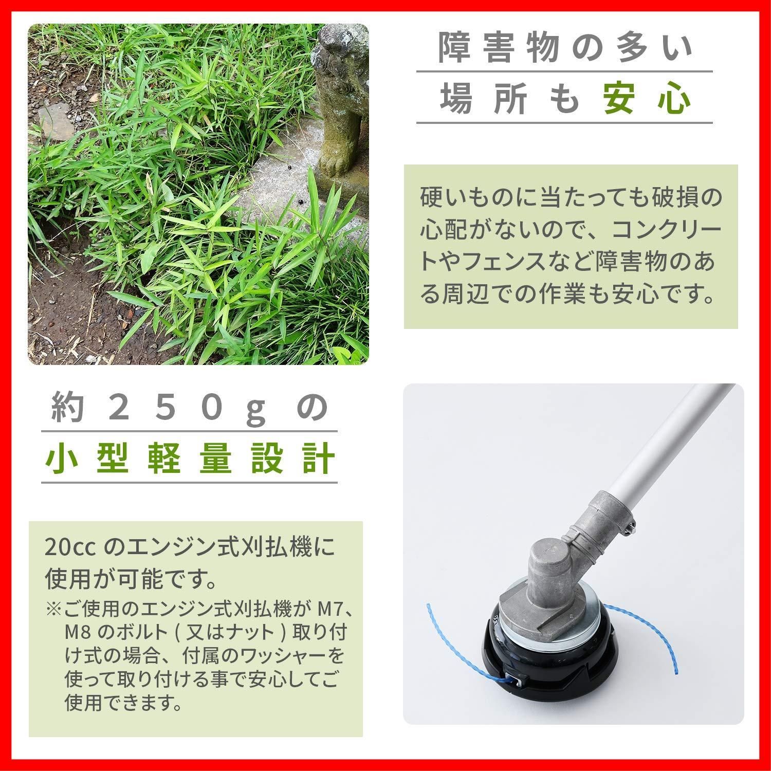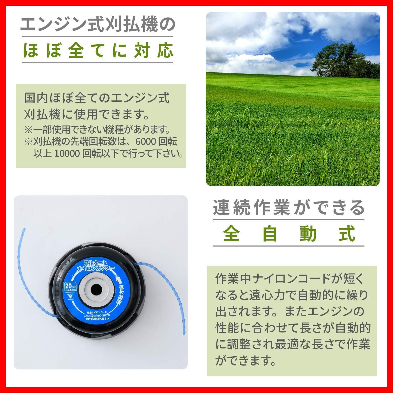 【特徴】国内ほぼ全てのエンジン式刈払機に使用可能なナイロンカッターです。(※一部使用できない機種があります) 連続作業ができる全自動式なので、作業中ナイロンコードが短くなると遠心力で自動的に繰り出されます。またエンジンの性能に合わせて長さが自動的に調整され最適な長さで作業ができます。硬いものに当たっても破損の心配がないので、コンクリートやフェンスなどの障害物のある周辺での作業も出来て便利です。
