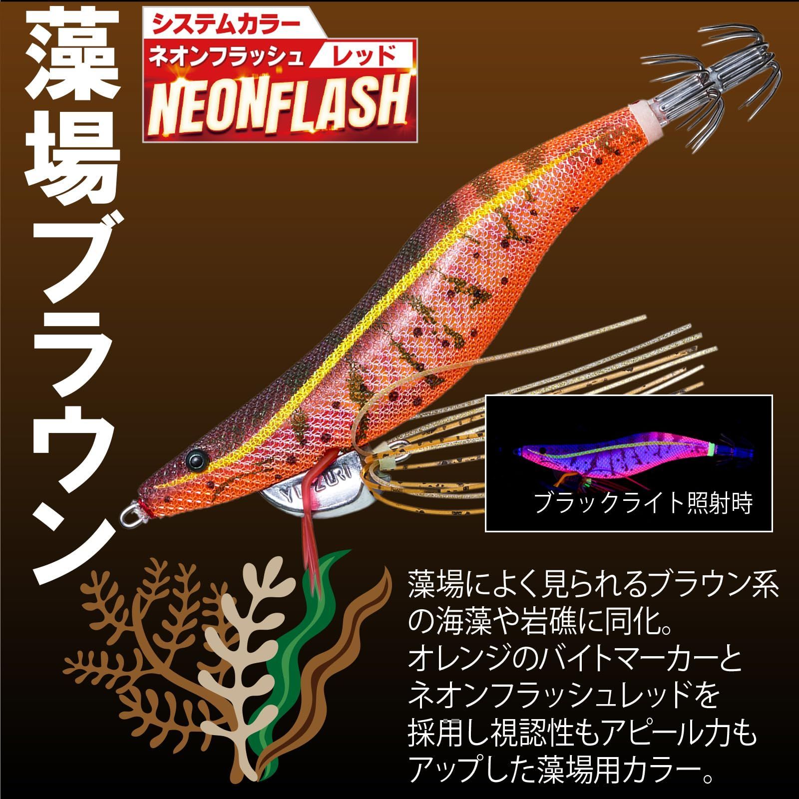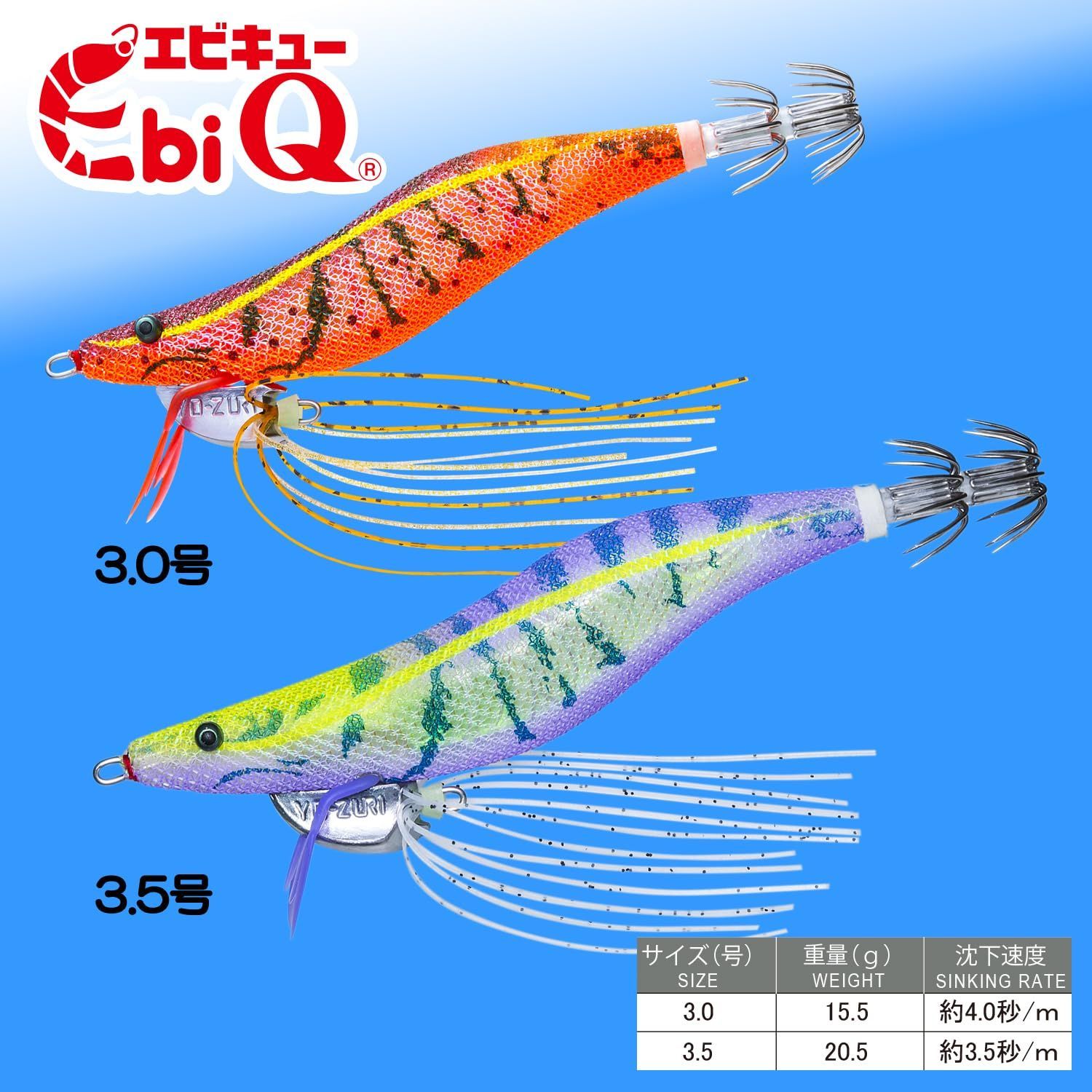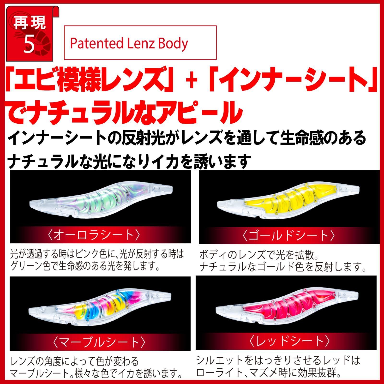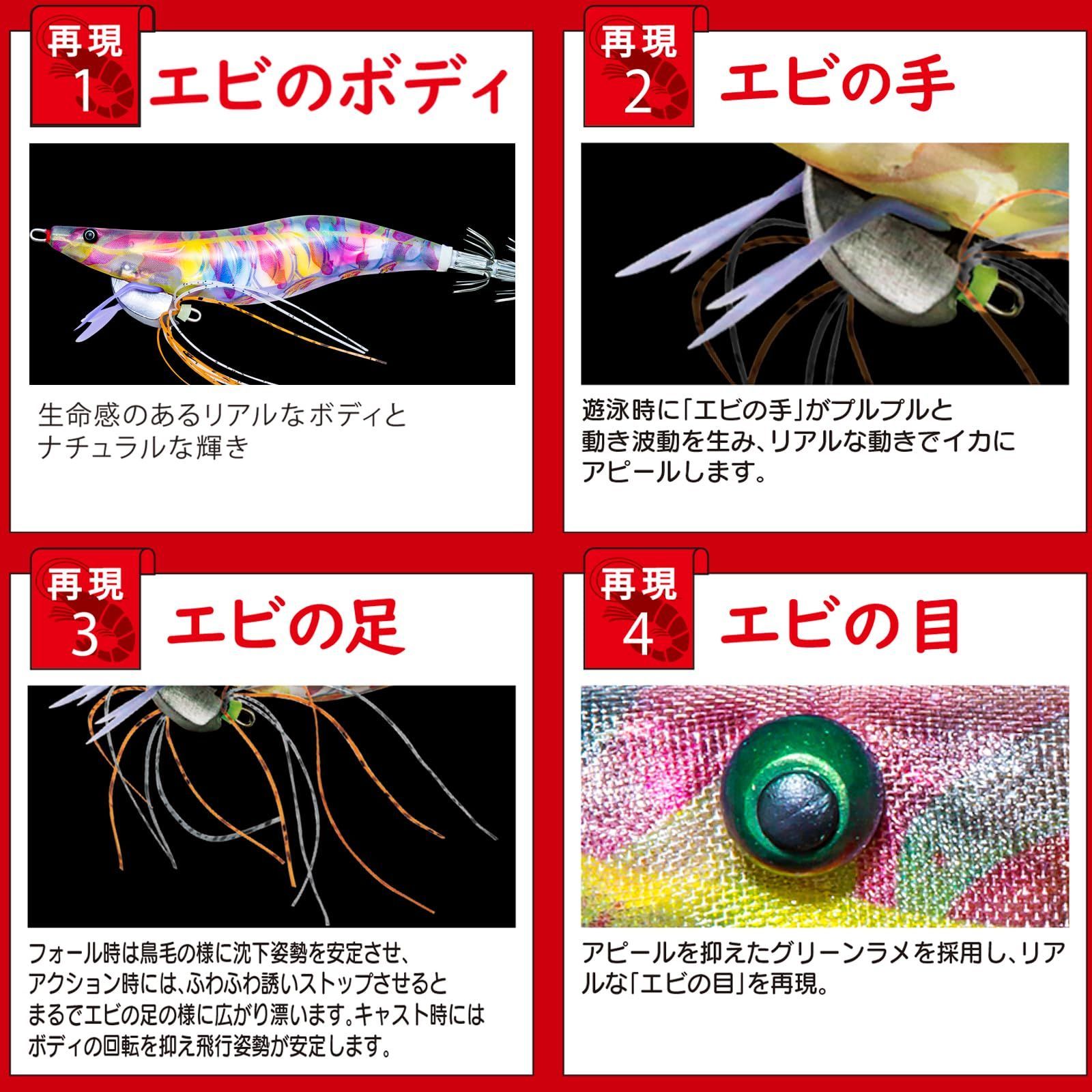 エビのボディ:生命感のあるリアルなボディとナチュラルな輝き。エビの手:遊泳時に 「エビの手」 がプルプルと動き波動を生み、リアルな動きでイカにアピールします。