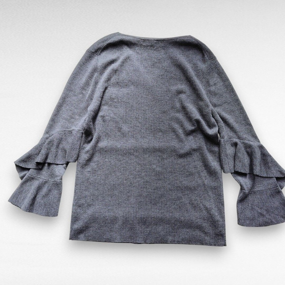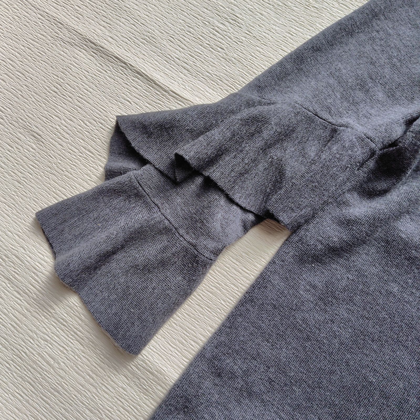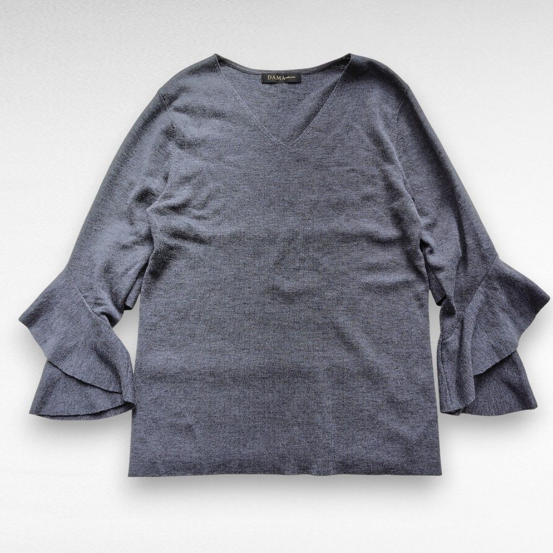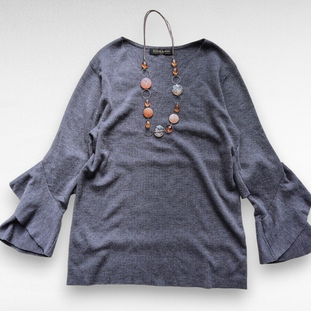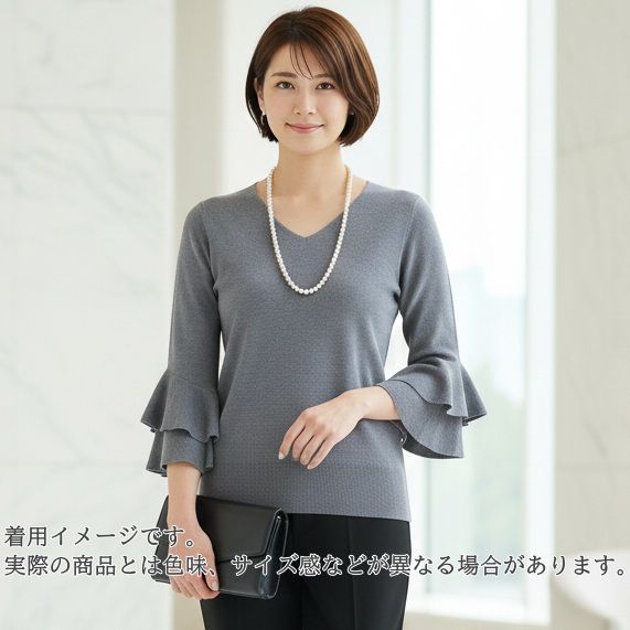 ご覧くださいませ。滑らかな肌触りのハイゲージウールを100%使用した、贅沢な一着です。最大の特徴は、手元で優雅に広がるティアードフリルの袖(ベルスリーブ)。手を動かすたびにひらりと揺れ、まるで花が咲いたような華やかさを演出いたします。デコルテを美しく見せるVネックが、甘さの中に大人の鋭さをプラスしております。