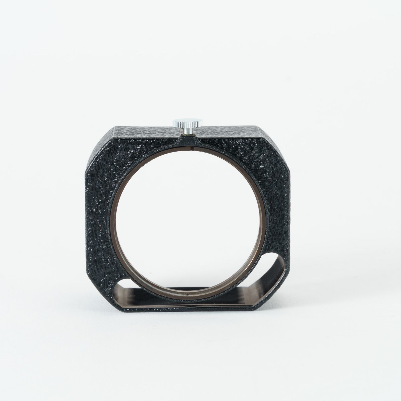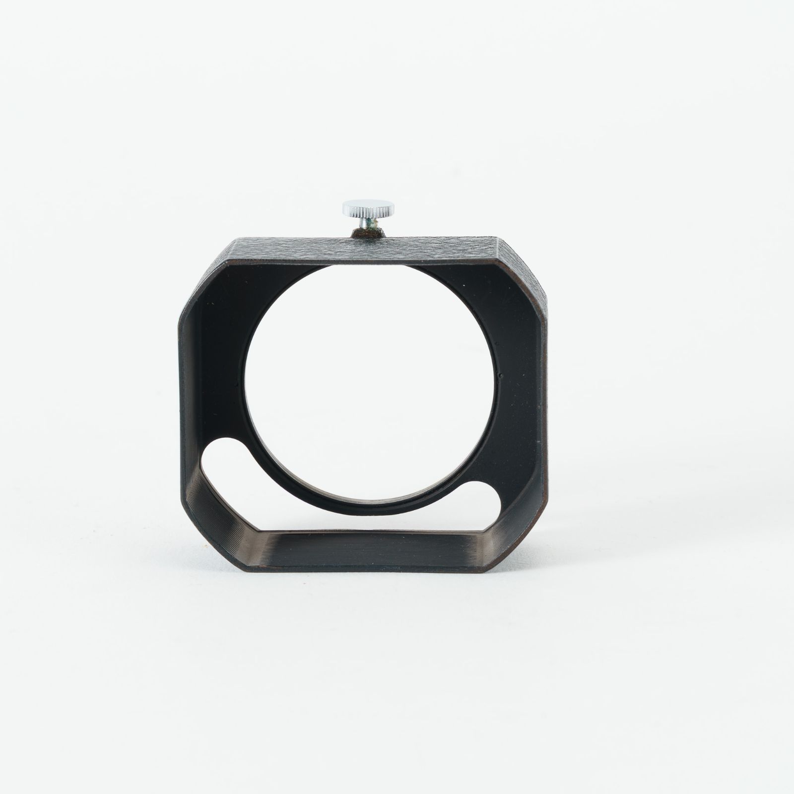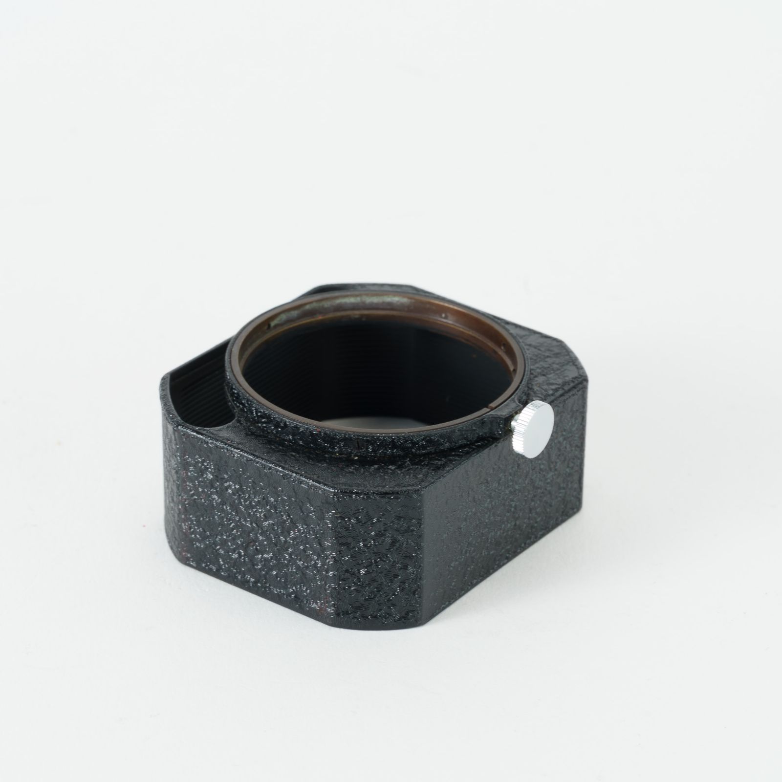 1951年発売。高級感のある表面加工やレンジファインダーの覗き窓を塞がない穴あき構造など、Summarit専用品として作られた専用フードです。上品なSummaritに角ばった無骨なデザインのコントラストがカッコ良いデザイン。四角いフードをつけるとこれぞビンテージカメラという気分になりますよね。