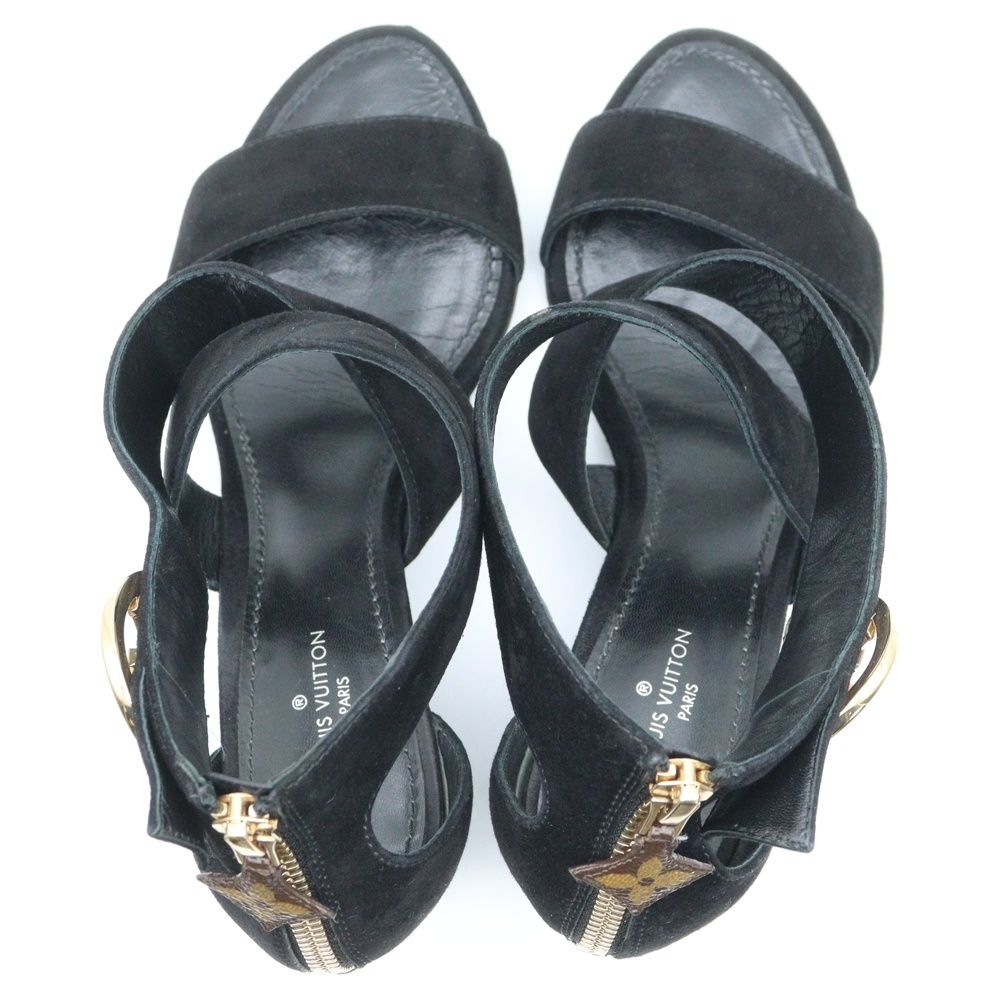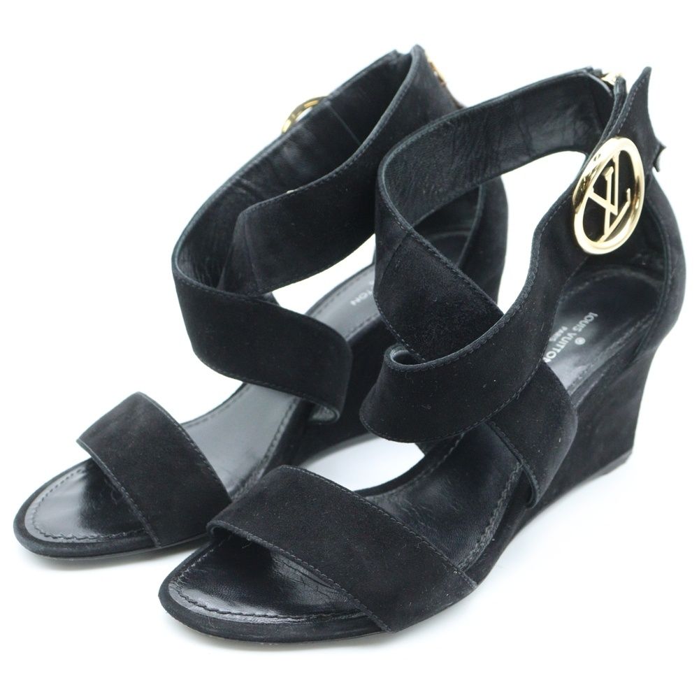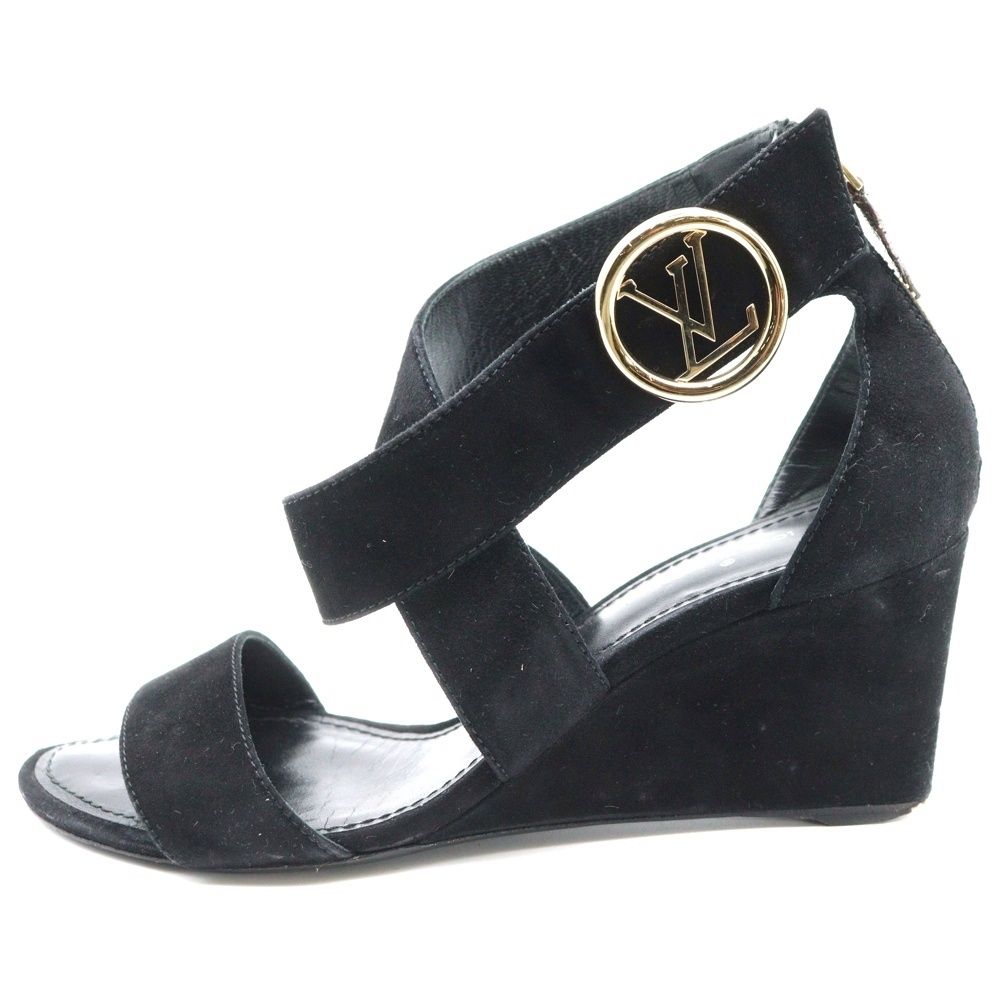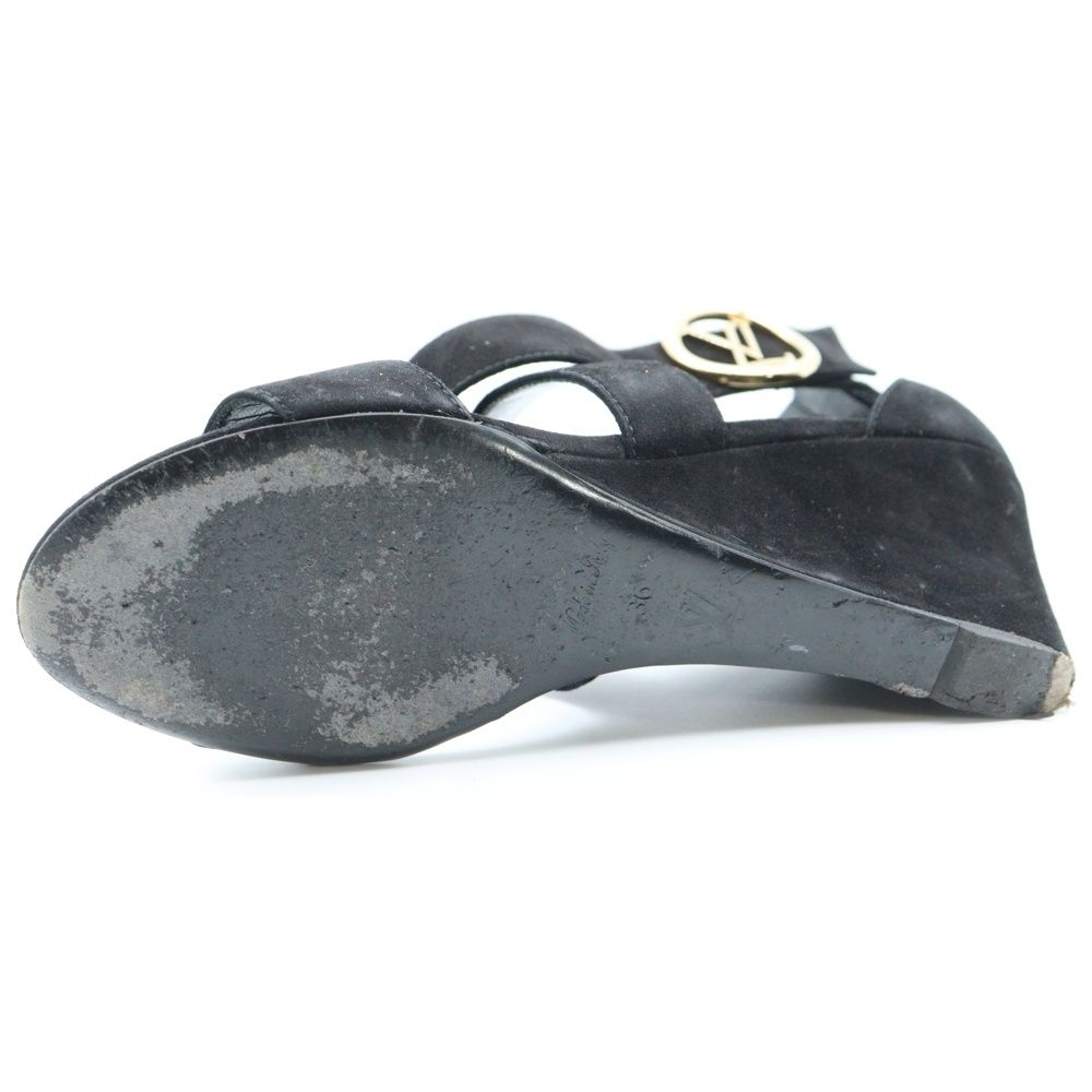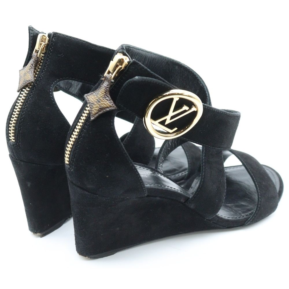 【品名】ホライズンライン LVロゴプレート スエードレザー ウェッジソール ヒール ストラップ サンダル シューズ ゴールド金具 ブラック レディース