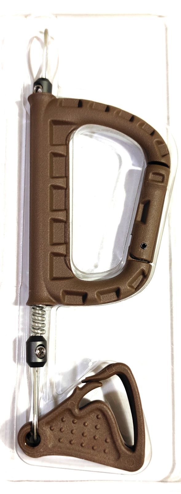 D形状のカラビナは高強度でサビないGFRP(ガラス繊維入強化プラスチック含有率55%)を採用し、45cmのびる内蔵Wセーフティロープの片側ループにはスナップホルダーを2pcs標準装備、もう一方のループには好みの小物グッズを取り付けできます。