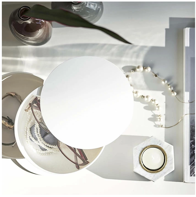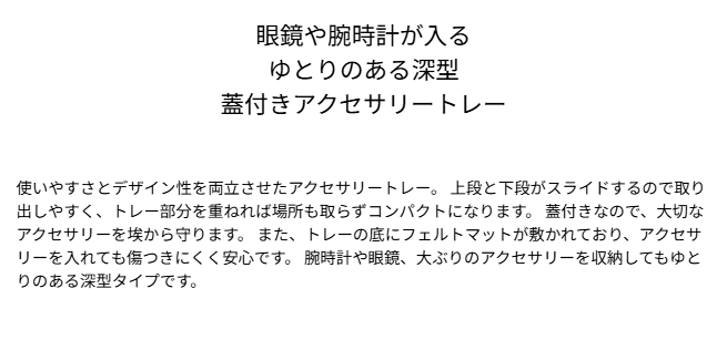 深さがあるので大ぶりのアクセサリーや玄関小物など収納できるアクセサリートレイ蓋付。
