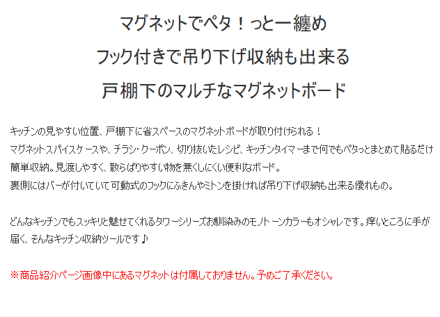 戸棚下フック付きマグネットボード タワー tower レシピ ホルダー マグネット 4920 4921 キッチン 収納 スチール 金属 便利 穴あけ不要 吊り下げ フック ホワイト ブラック 山崎実業 yamazaki YAMAZAKI TOWER
