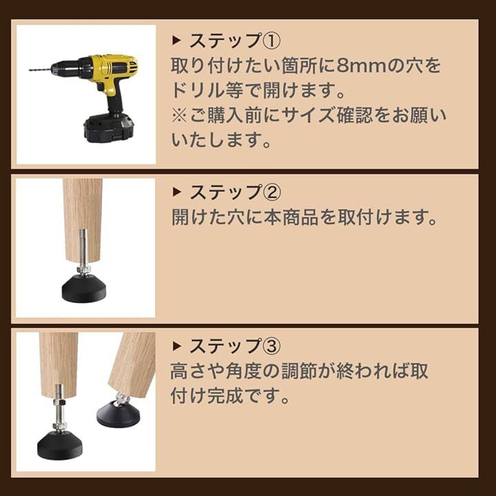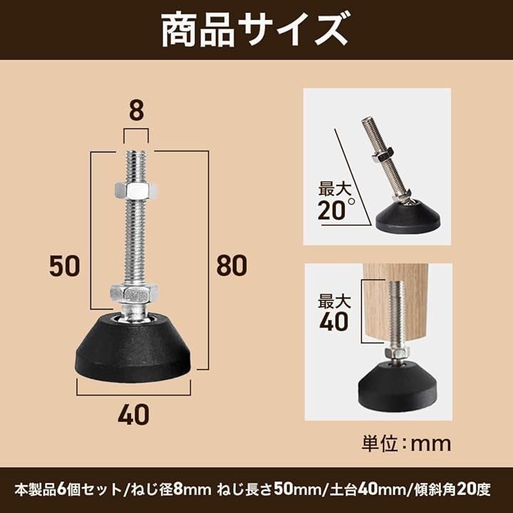 8mmのネジ径、50mmのネジ長さ、40mmの基部径を持つ調整脚を使用します。