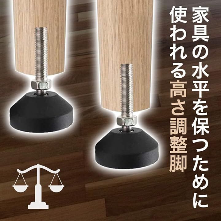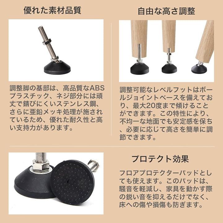「防音対策と床保護機能」家具の水平を保つために使われる調整脚は、地面の湿気から家具を守る効果もあり、さらに床を保護するフロアプロテクターパッドとしても使えます。