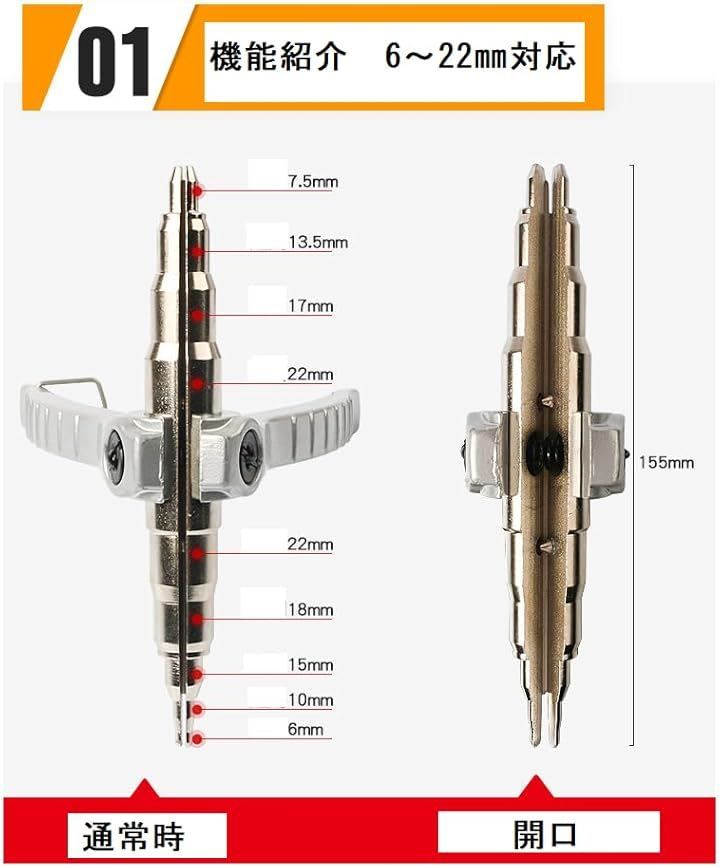 拡張可能なサイズは、6mmから22mmまでの範囲で、具体的には6mm、7.5mm、10mm、13.5mm、15mm、17mm、18mm、そして22mmという9つの異なるサイズにアジャストすることが可能です。