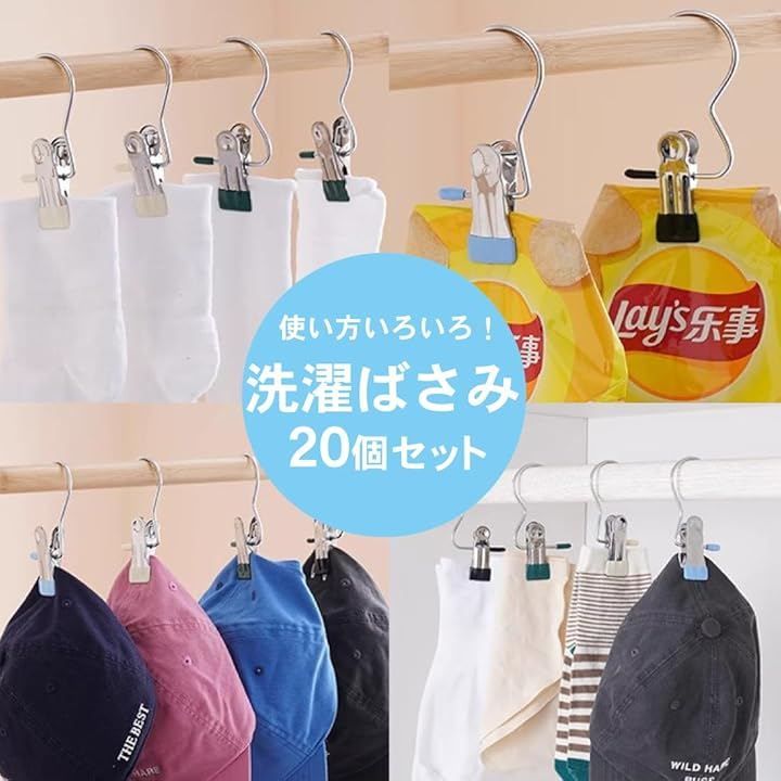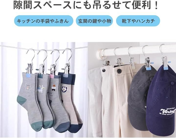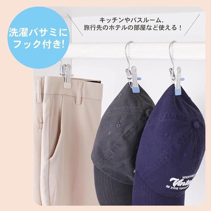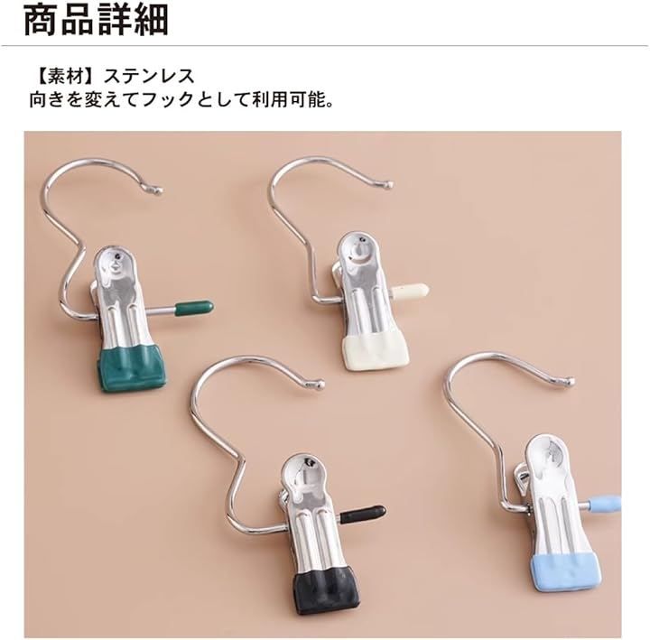 「洗濯バサミにフック付き」家庭での日常使用はもちろん、洗濯店や旅行、業務用にも適した多用途アイテムです。