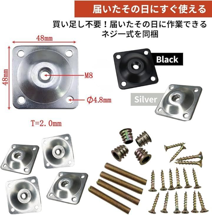 「商品詳細」セット内容:本体 x 4枚、ハンガーボルト x 4本、取り付けネジ x 16本、鬼目ナット x 4本 サイズ:48mm x 48mm 対応ネジサイズ:M8 カラー:シルバー / ブラック