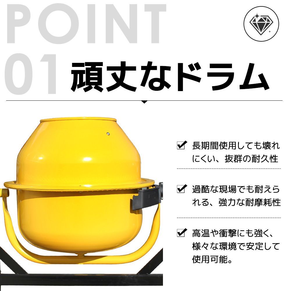 【パワフルモーター搭載!効率よく撹拌できる電動コンクリートミキサー】✔ パワフルモーター搭載で効率よく撹拌、作業もスムーズ。✔ 重い材料もラクに混ぜられる、快適に作業可能。✔ 長時間の使用でも安定した性能を発揮。