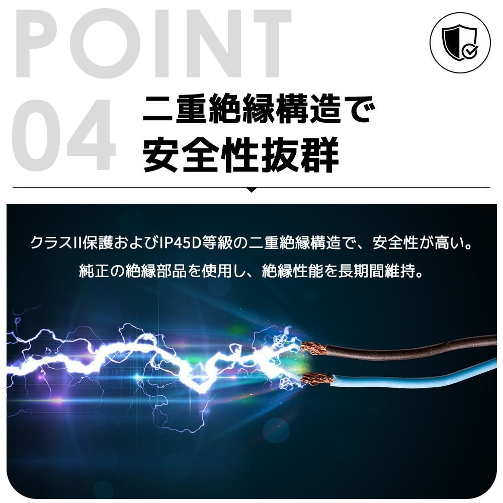 【二重絶縁構造で安全性抜群】クラスII保護およびIP45D等級の二重絶縁構造で、安全性が高い。純正の絶縁部品を使用し、絶縁性能を長期間維持。IP45D等級により、ドラムの洗浄も安全に行える。ホースで簡単に洗浄でき、すぐに次の作業へ移行可能。