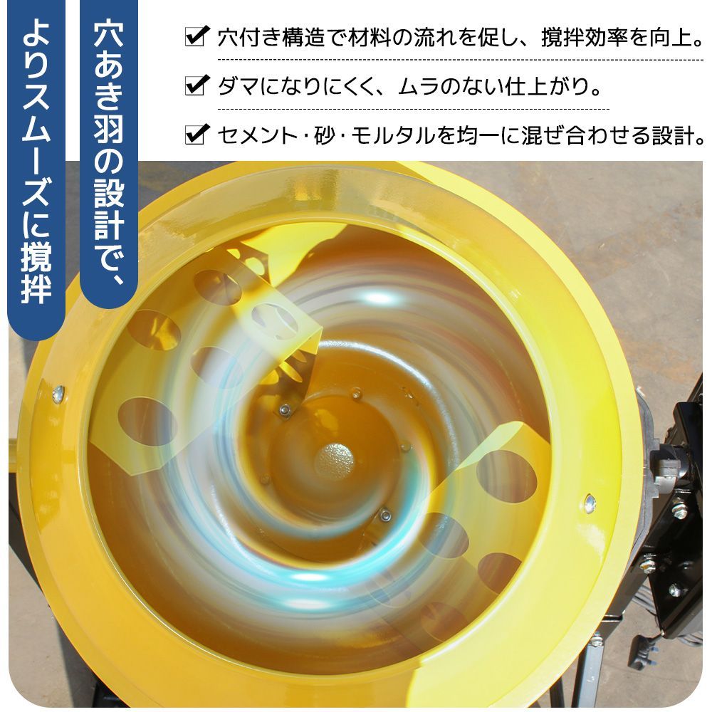 【穴あき羽の設計で、よりスムーズに撹拌】✔ 穴付き構造で材料の流れを促し、撹拌効率を向上。✔ ダマになりにくく、ムラのない仕上がり。✔ セメント・砂・モルタルを均一に混ぜ合わせる設計。タイヤ付きで移動もスムーズ