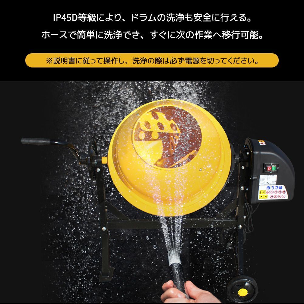 【高性能電動コンクリートミキサーの特徴】✔ 頑丈なドラム:長時間使用しても壊れにくく、耐久性と耐摩耗性に優れています。✔ パワフルモーター搭載:効率よく撹拌し、作業を素早く進めることができます。✔ 簡単操作&スムーズ移動:タイヤ付きで、現場内での移動が簡単で、操作もシンプルです。✔ 360°回転設計:最大360°まで回転し、材料の排出や清掃がスムーズに行えます。✔ 穴あき羽設計:撹拌効率が向上し、ムラなく均一に材料を混ぜ合わせます。✔ 二重絶縁構造で安全性抜群:クラスII保護とIP45D等級の防水・防塵設計で、高い安全性を実現。