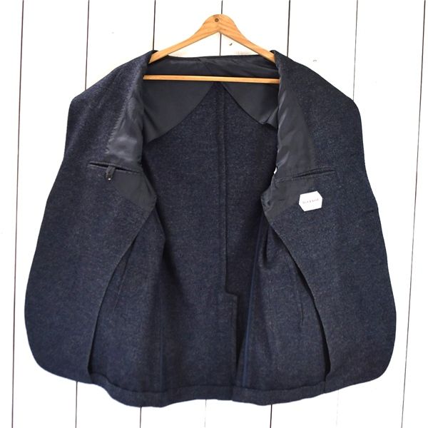 3つボタンシングル。段返り。パッチポケット。センターベント。袖口3つボタン。開き見せ。背抜き。ネーム刺繍なし。この機会に是非!