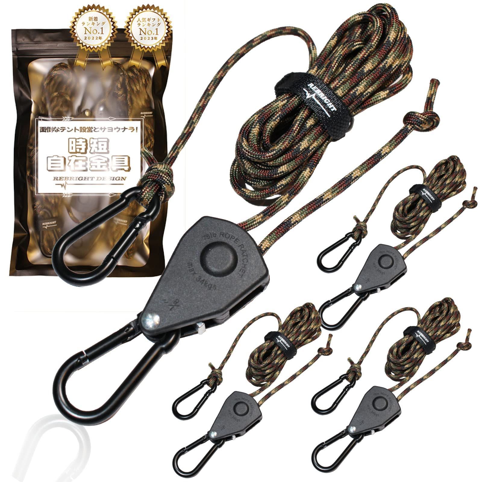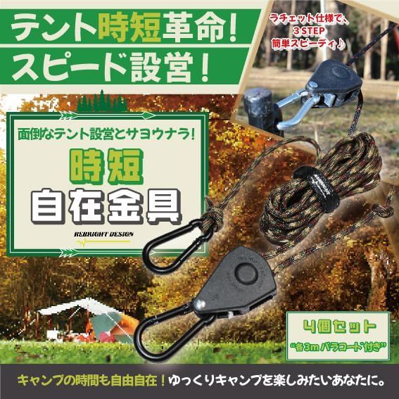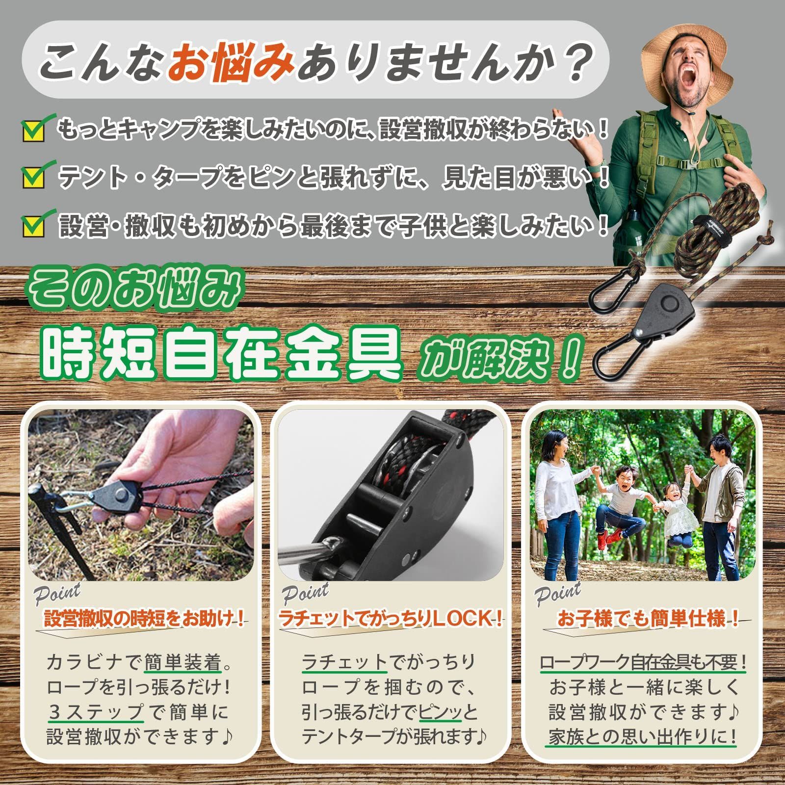大反響につきリニューアル!!4個セットには、本体のラチェット型自在金具に、「ブラックカラビナ」&「キャンプに映える迷彩柄ガイロープ(3m)」&「収納時に便利なロープをまとめるマジックテープ」「持ち運びに便利な巾着型専用収納袋」の4点を標準装備しました。