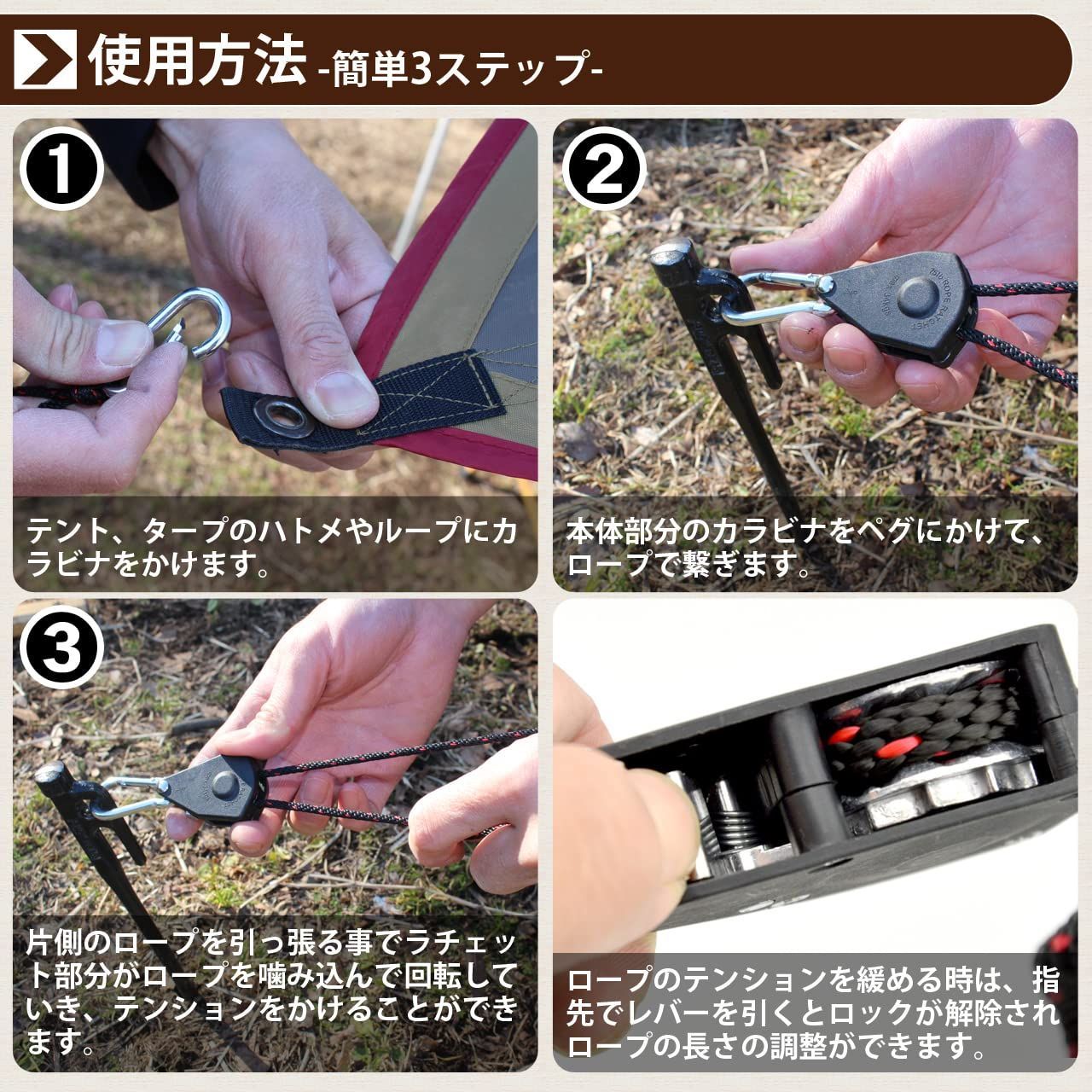 ご使用方法】①テント、タープにカラビナで装着。②一方のカラビナをペグに繋げます。③片側のロープを引っ張るだけで、ピンとロープを張ることができます[3アクション完了♪]長さの調整も超簡単♪