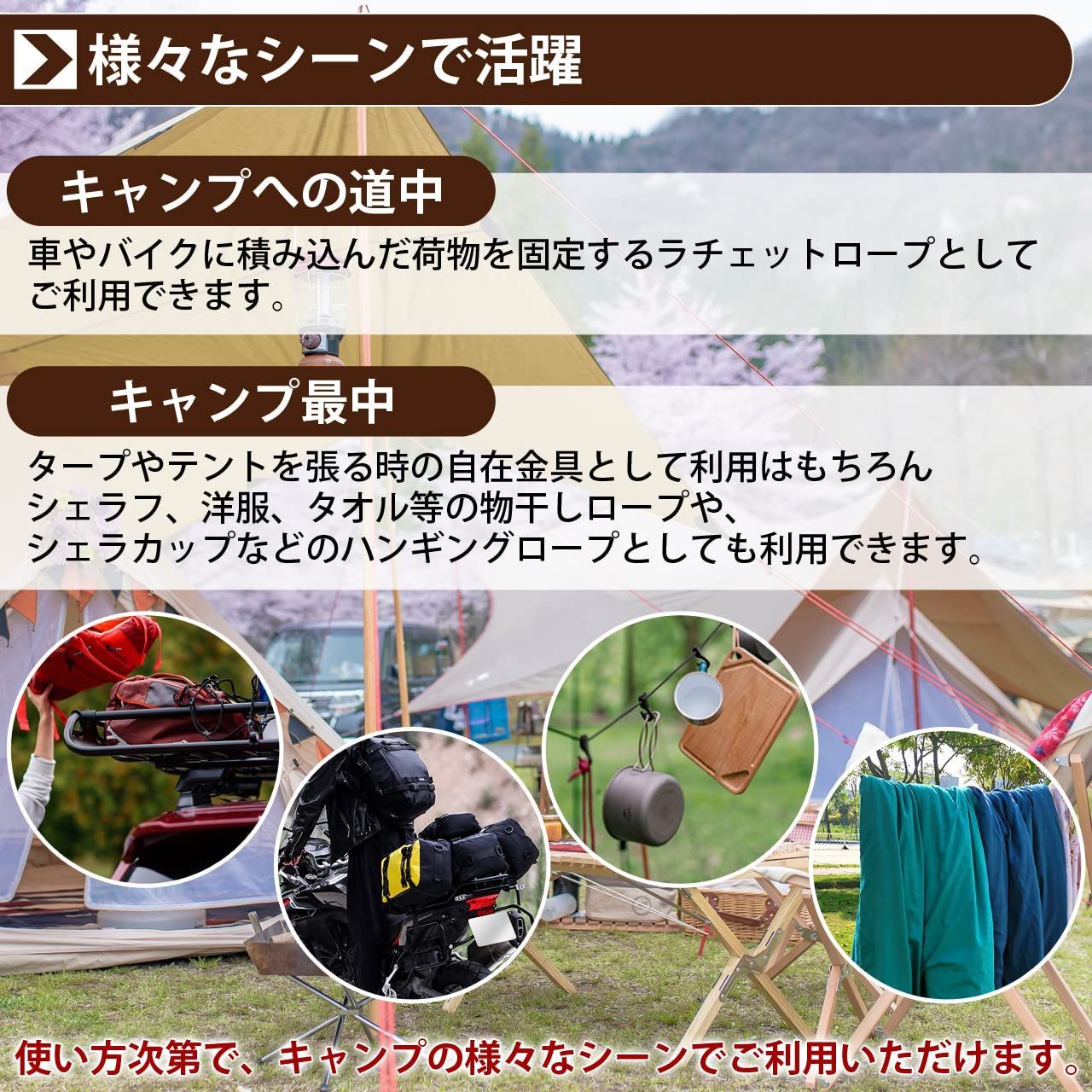 【様々なキャンプシーンで大活躍!】テント、タープの設営の自在金具としてはもちろん、車へ積み込んだキャンプ道具の固定に!バイクの荷台への道具の括り付けに!シェルフやタオルの物干しロープに!シェラカップ等のハンギングに!おうちに帰ったら、キャンプ道具をまとめるロープとしてご活用ください♪