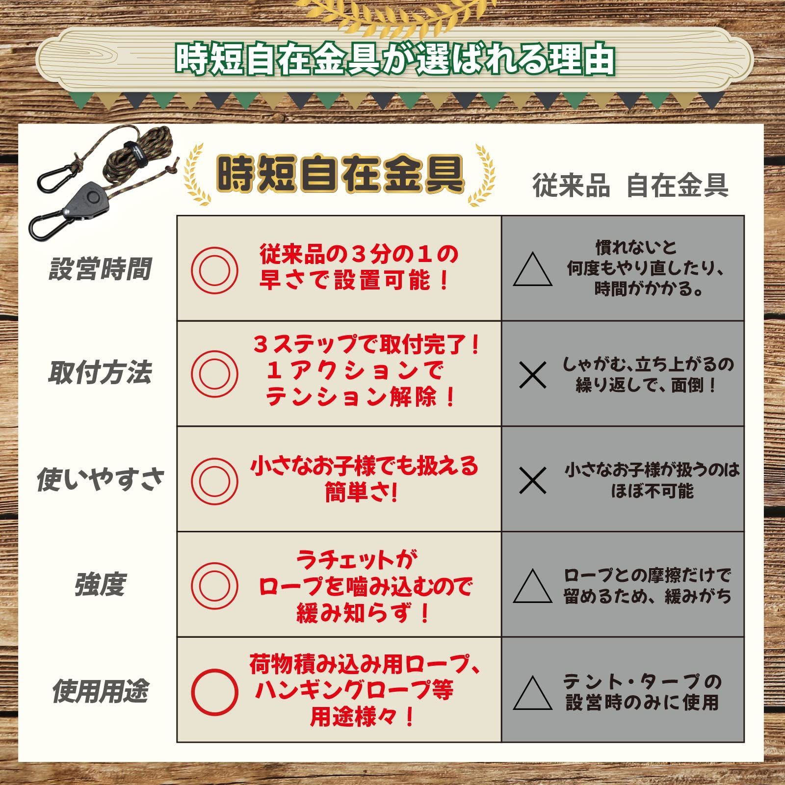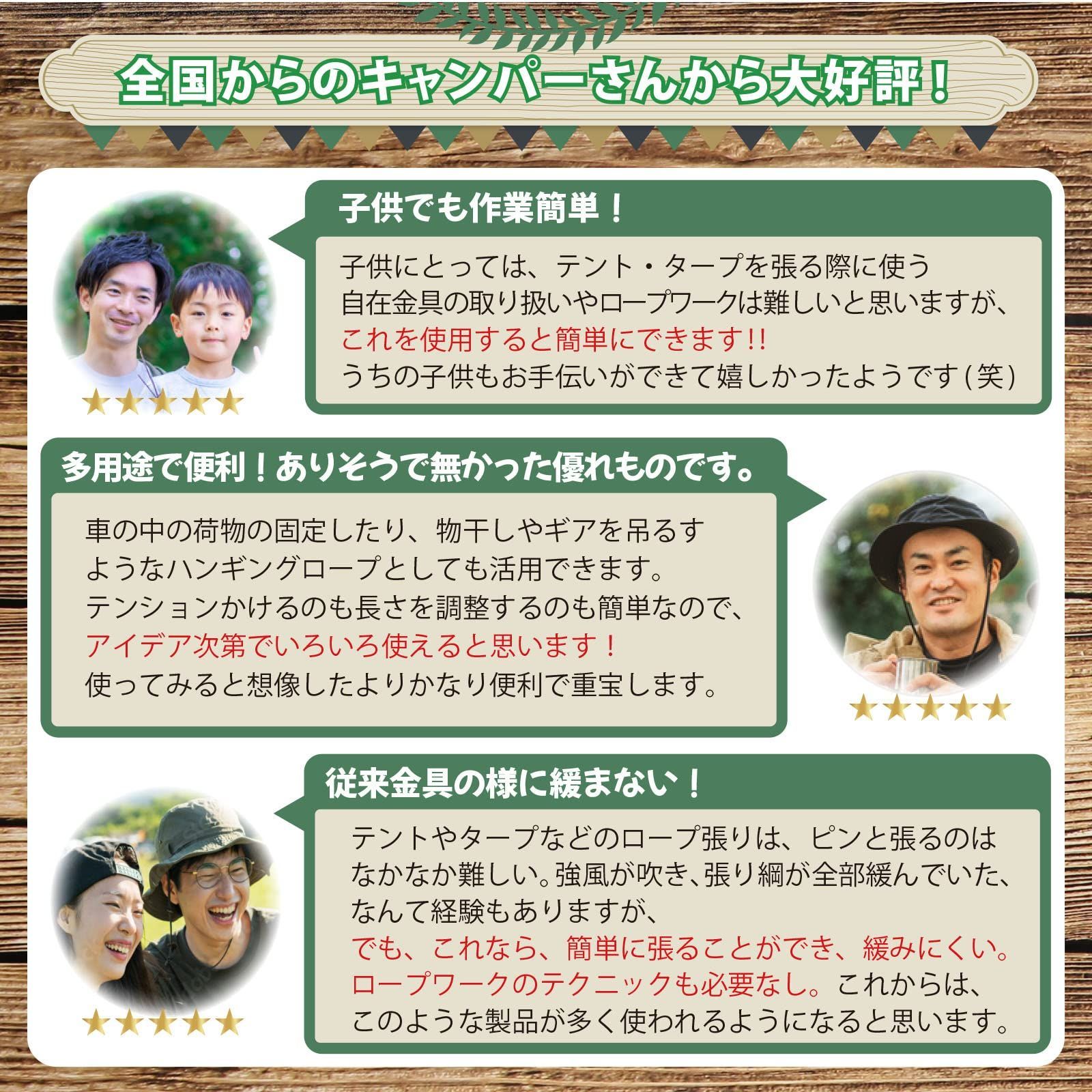 【超簡単仕様】力不要で、手元の作業でテントやタープのロープにテンションを掛けられるので、お子様や女性でも簡単に使用できます。お子様と一緒にキャンプ設営をお楽しみいただけます。きっと良い思い出作りのお役に立てるはずです♪