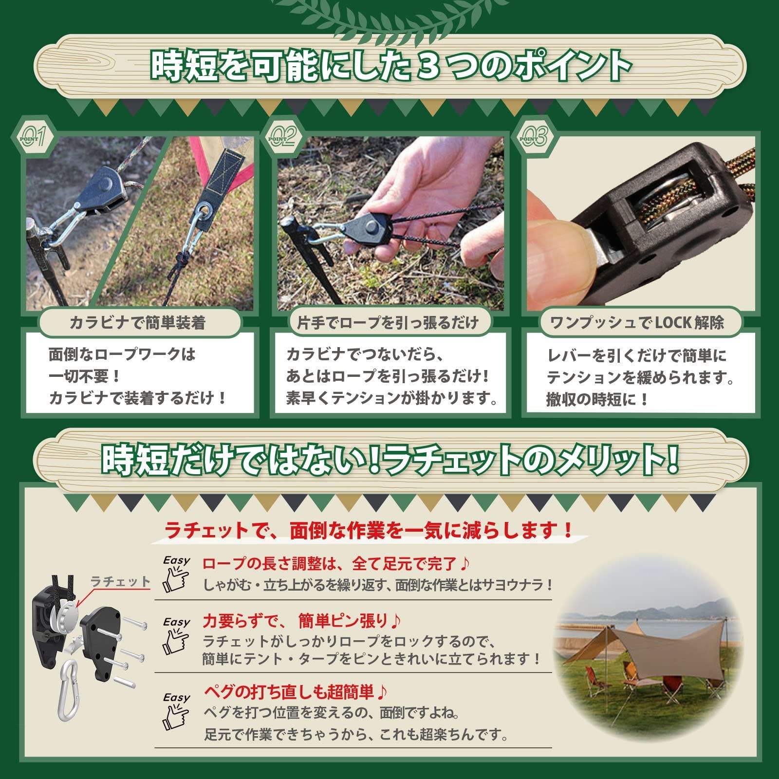 【キャンプ設営の超時短に!】面倒なロープワークが不要!簡単にテントやタープ設営ができます。早くキャンプしたいのに、なかなか設営が終わらない~!とお悩みの方に是非!