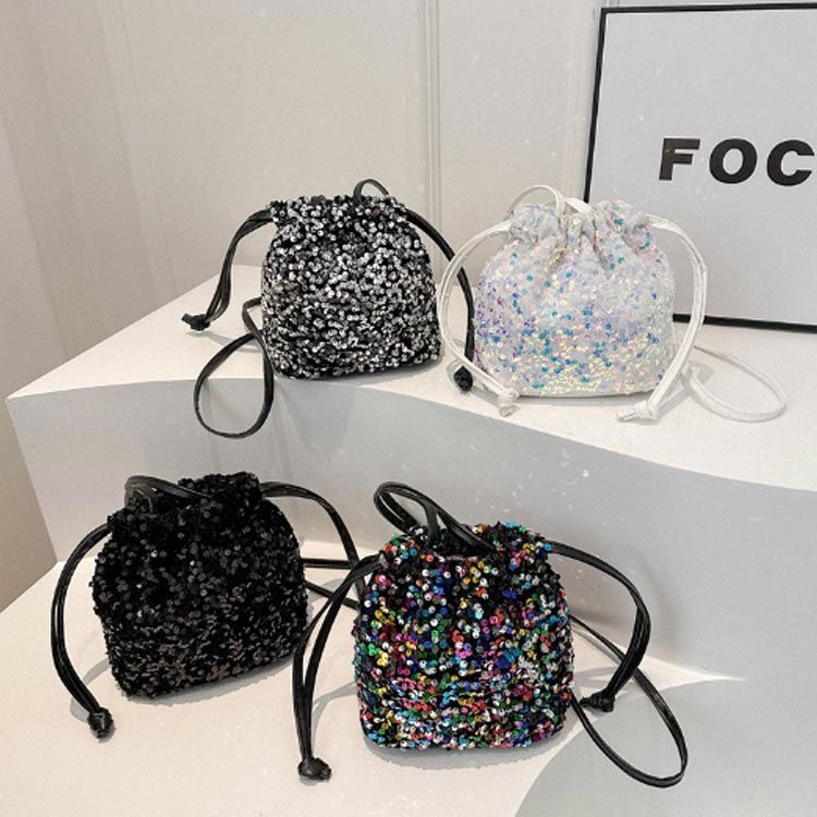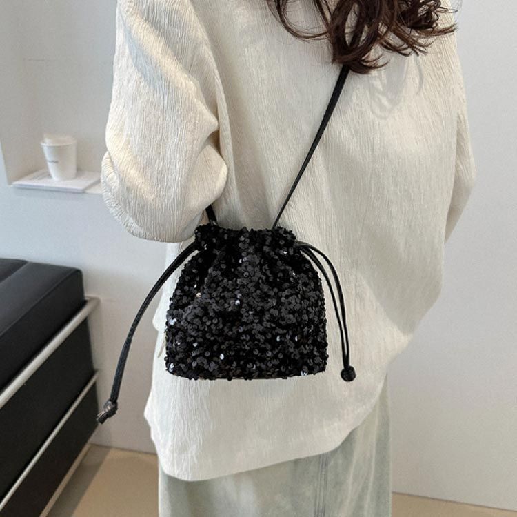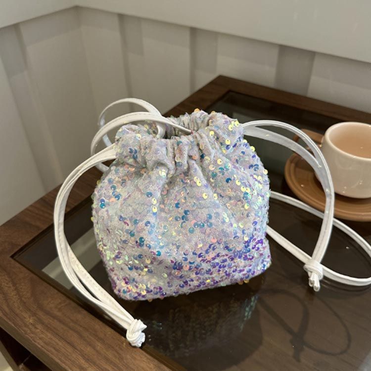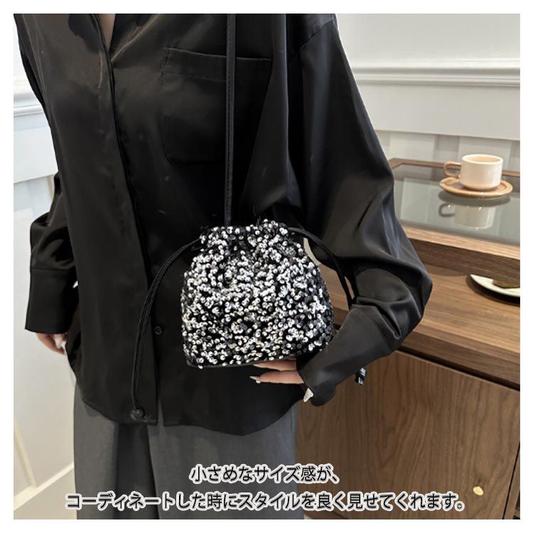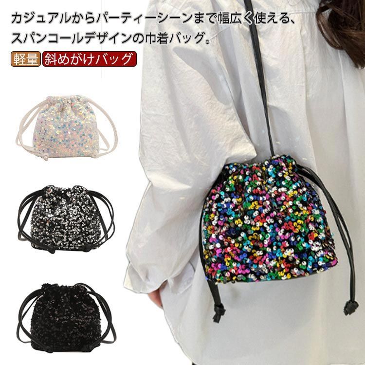 カジュアルからパーティーシーンまで幅広く使える、スパンコールデザインの巾着バッグ。