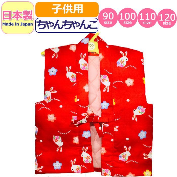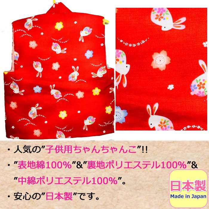 日本製 ちゃんちゃんこ 子供 キッズ 女の子 男の子 花 うさぎ はんてん 半天 女児 男児 幼児 園児 小学生 赤ちゃん 赤 レッド 日本製ちゃんちゃんこ !90、100、110、120の4サイズ。