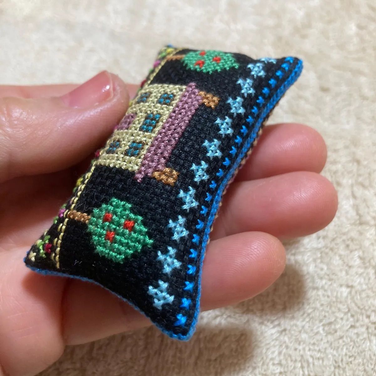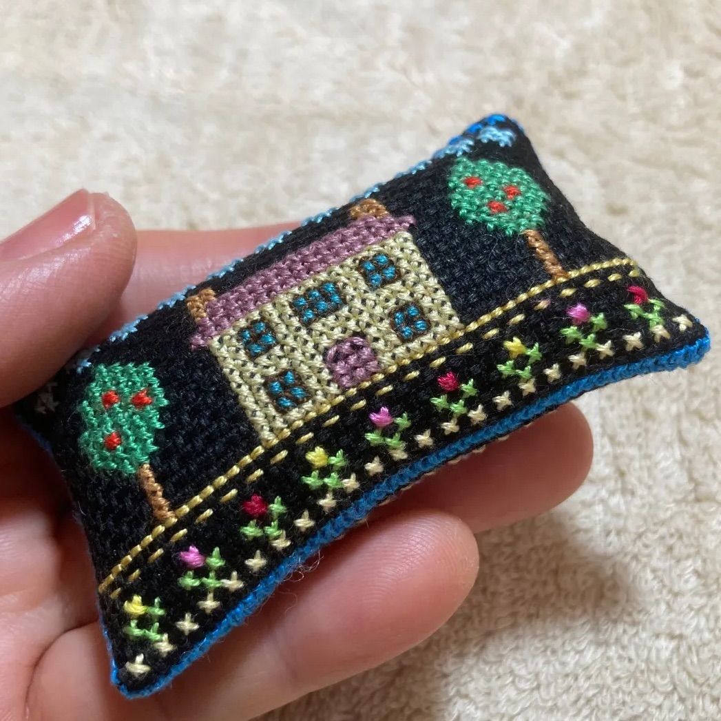 黒の生地におうちとお花のモチーフをステッチしました。