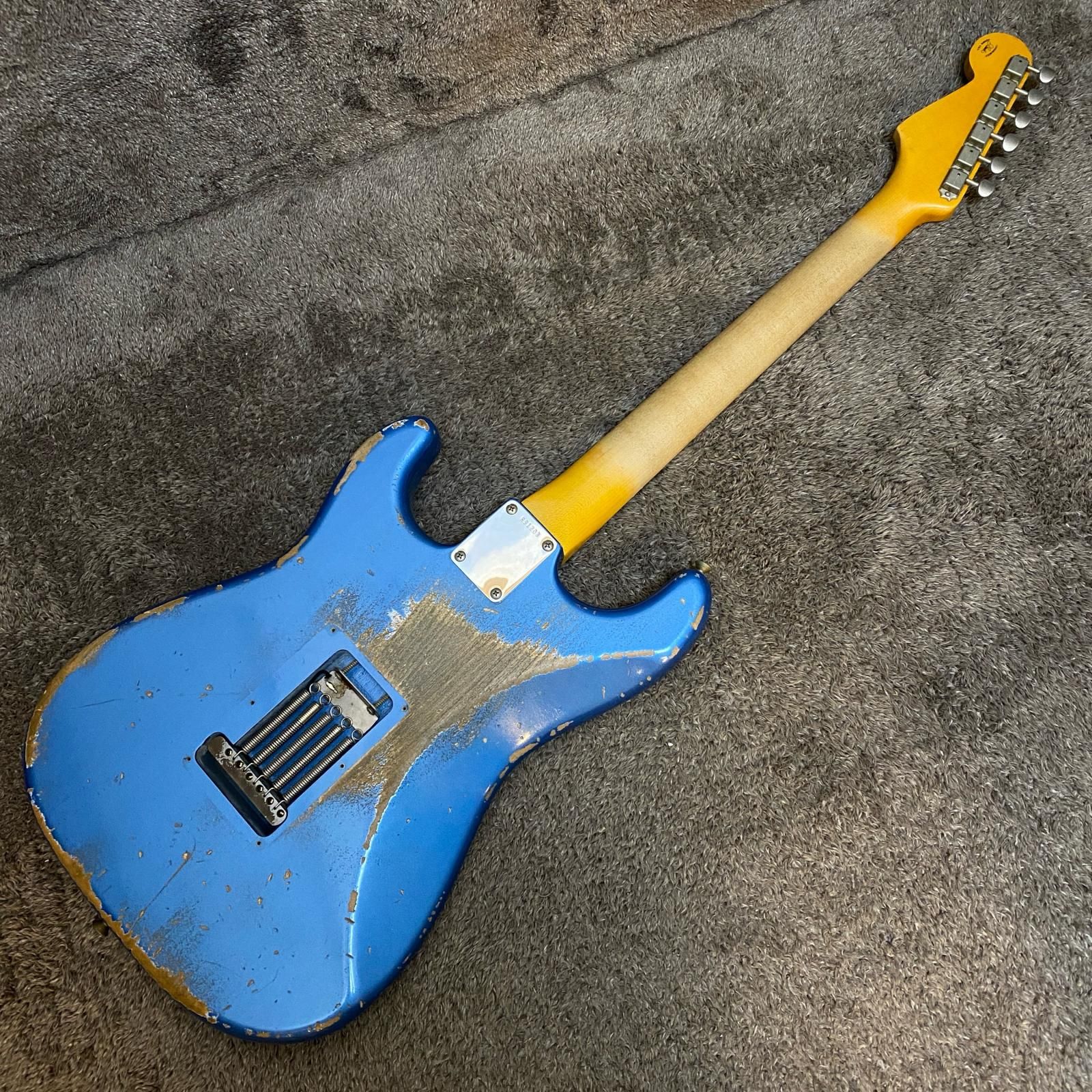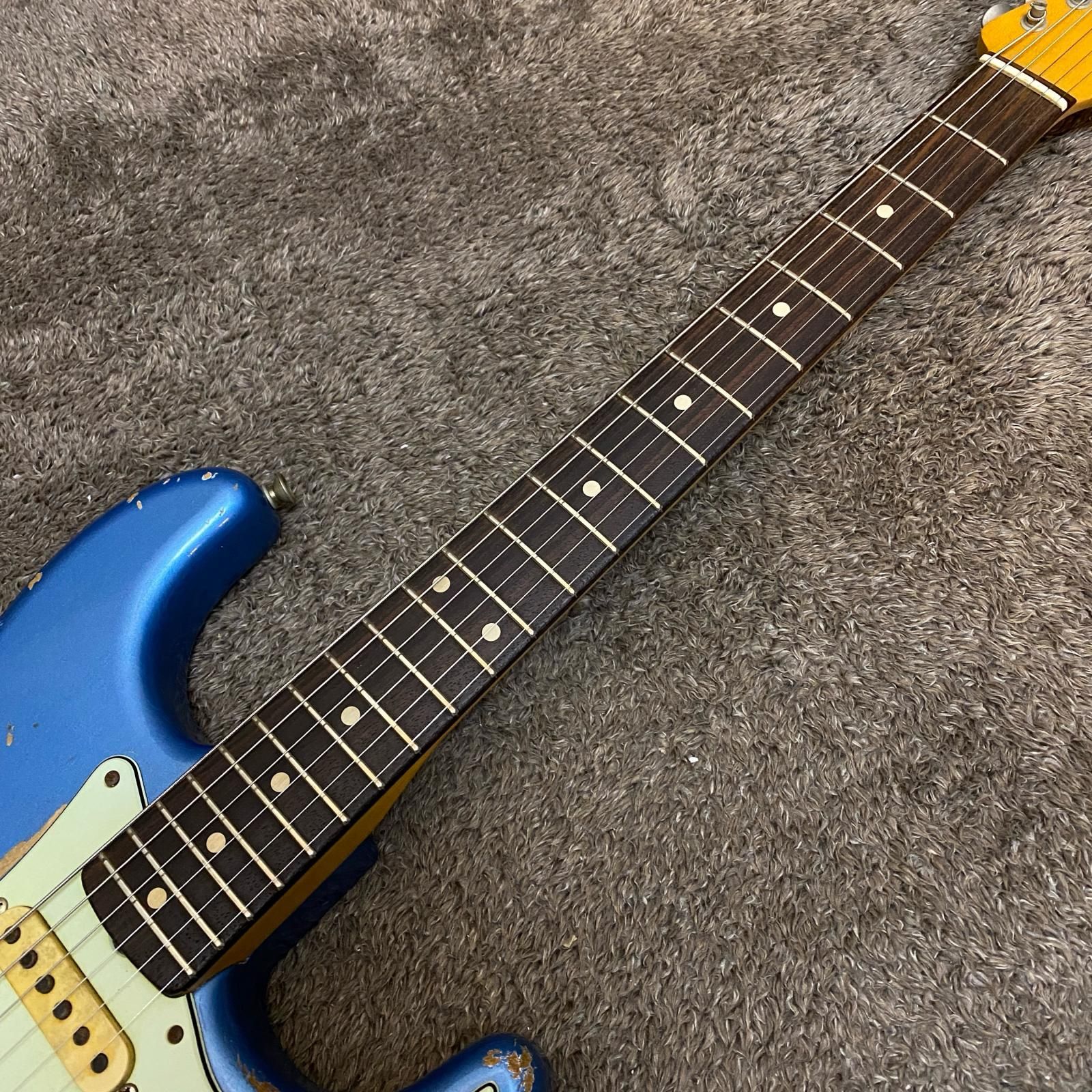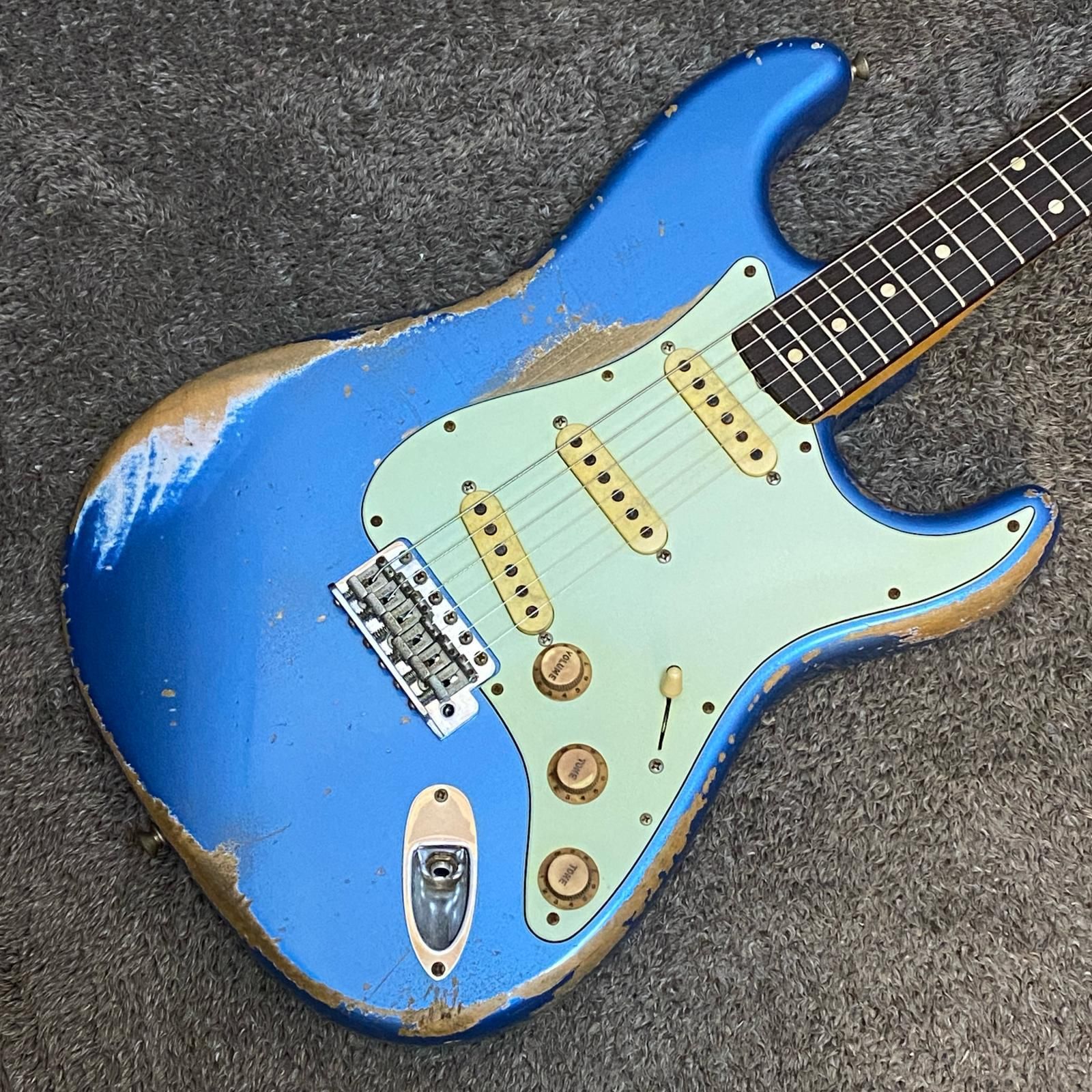 ‘50sを採用。レイクプラシッドブルーにヘビィレリックを施したクールな一本です。実際に手を取って感じていただきたいのですが、マスタービルダーならではの、細かな部分までこだわられた職人技にロマンを感じます。状態としましては、レリックモデルのため追加で付いたダメージは不明です。フレットは残り8~9割程と十分残っており、ネック状態も良好。トラスロッドも十分余裕があるため、楽器としての機能もバッチリ。コレクション、プレイヤーどちらにもおすすめの個体です。