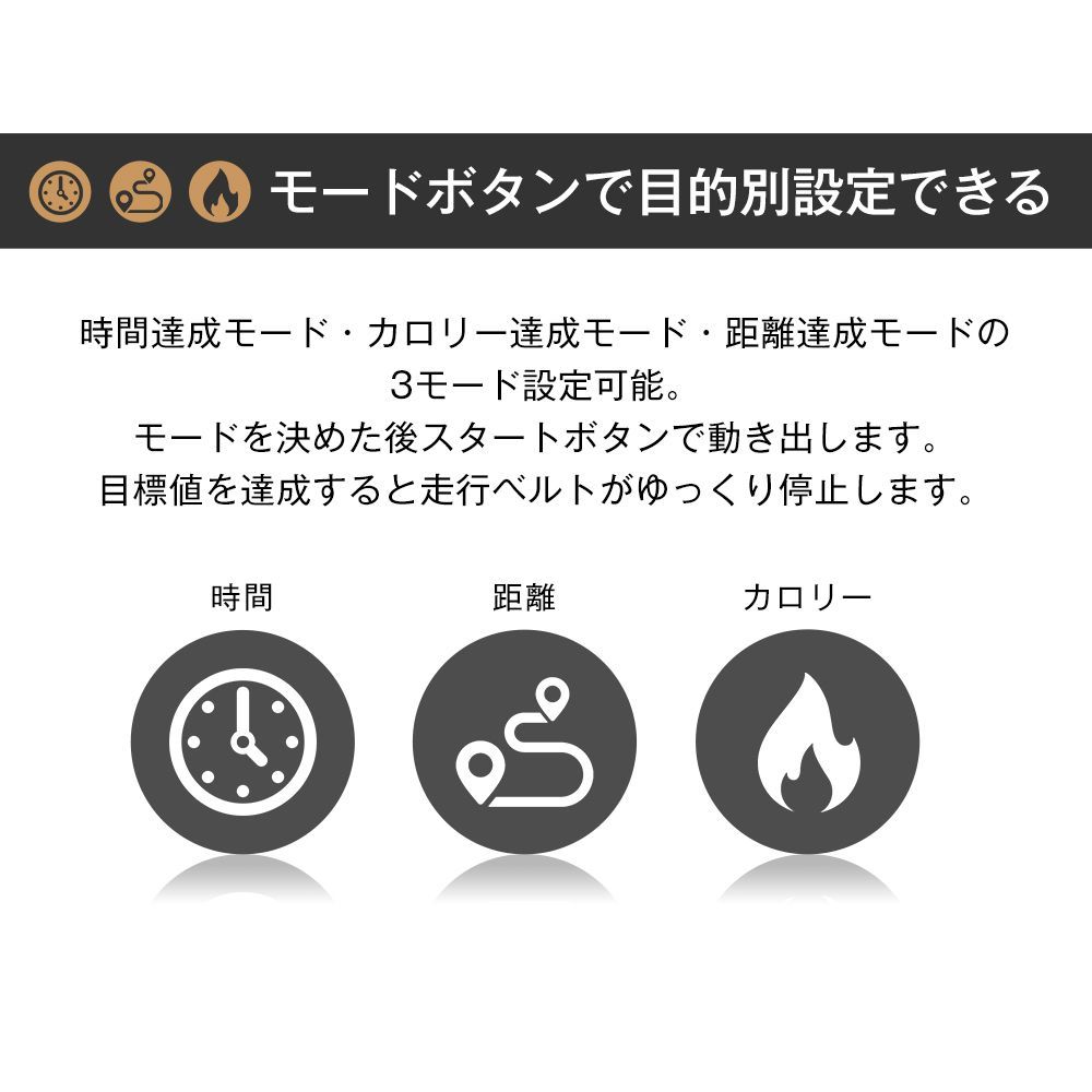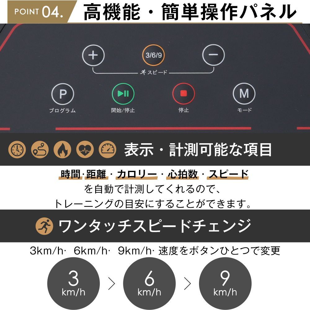 【高機能・簡単操作パネル①表示・計測可能な項目(小标题)時間・距離・カロリー・心拍数・スピードを自動で計測してくれるので、トレーニングの目安にすることができます。②ワンタッチスピードチェンジ(小标题)3km/h· 6km/h· 9km/h· 速度をボタンひとつで変更③モードボタンで目的別設定できる(可设定3种模式)(小标题)時間達成モード・カロリー達成モード・距離達成モードの3モード設定可能。モードを決めた後スタートボタンで動き出します。目標値を達成すると走行ベルトがゆっくり停止します。④12種類のオートプログラム搭載(12种程式)(小标题)設定した時間内で速度が自動的に切り替わるプログラムを搭載。トレーニングを楽しめる!スマホやUSBメモリで音楽再生可能