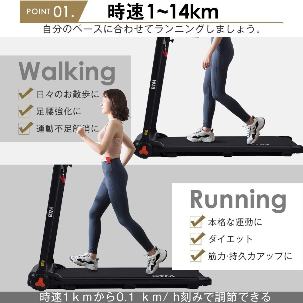 【時速1~14km】自分のペースに合わせてランニングしましょう。✔日々のお散歩に ✔本格な運動に✔足腰強化に ✔ダイエット✔運動不足解消に ✔筋力·持久カアップに時速1kmから0.1 km/ h刻みで調節できる。