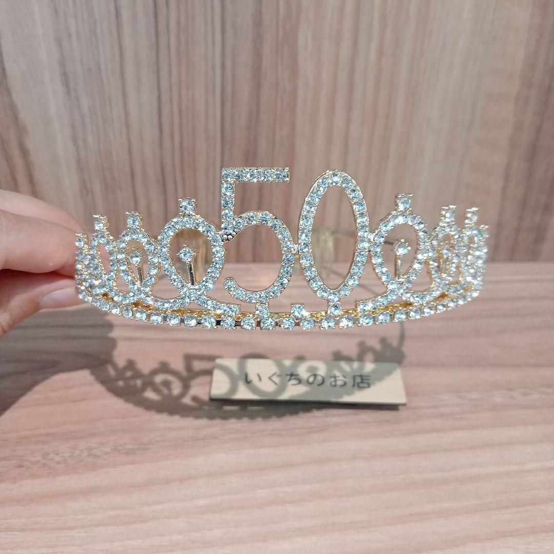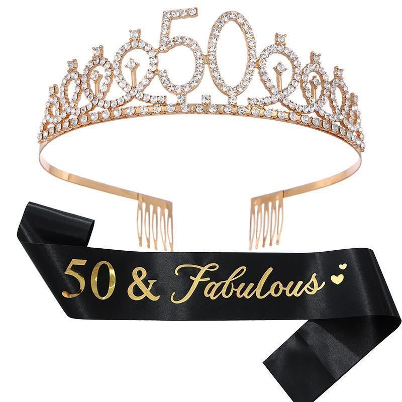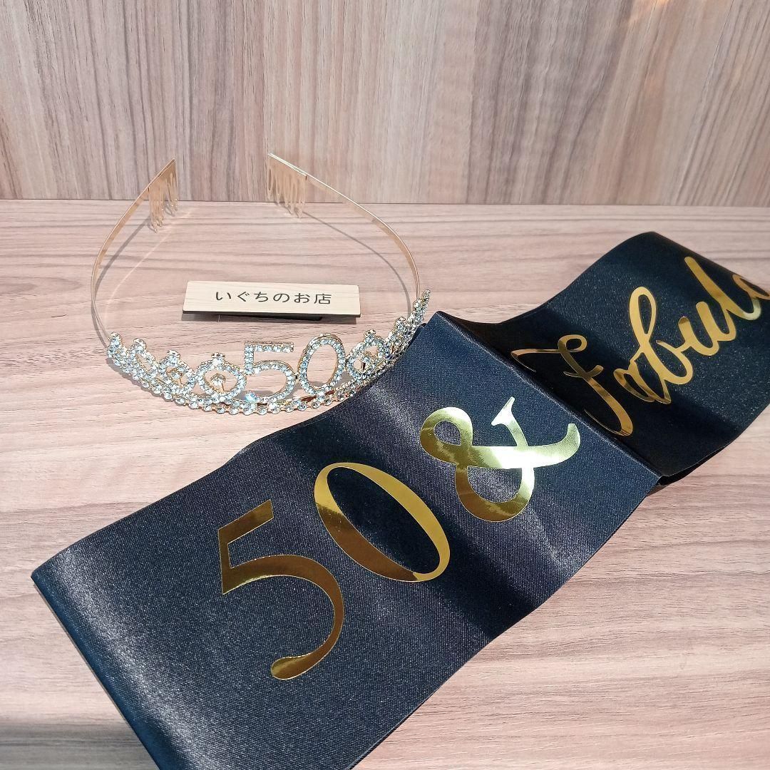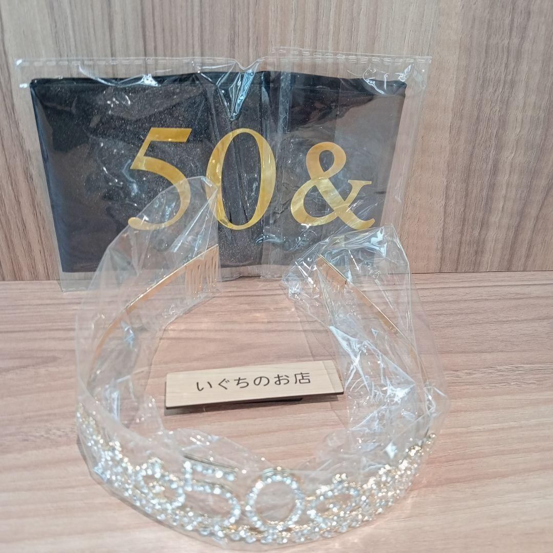 「50 & Fabulous」の文字が入った豪華なティアラとサッシュ(タスキ)のセットです。