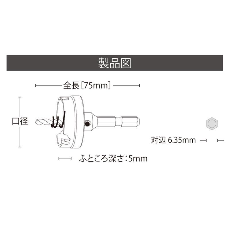 【仕様】 ●刃径(mm):22 ●シャンク径(mm):6.35 ●刃厚(mm):1.9 ●有効長(mm):3.2 ●適合機種:充電ドリル、電気ドリル(400W以下) ●フトコロ深さ(mm):5 ●適合センタードリル: