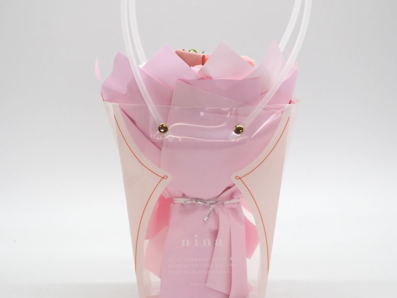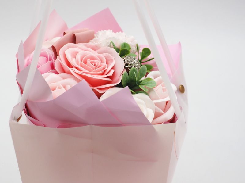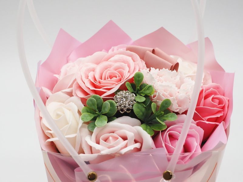 造花ならぬ“ソープ素材”で仕立てられた美しい「フラワーソープ」ブーケです。生花にしか見えない華やかなデザインながら、水やり不要・枯れずに長くお楽しみいただけるアイテムです。ギフト用途にも、インテリア用途にもぴったりです。