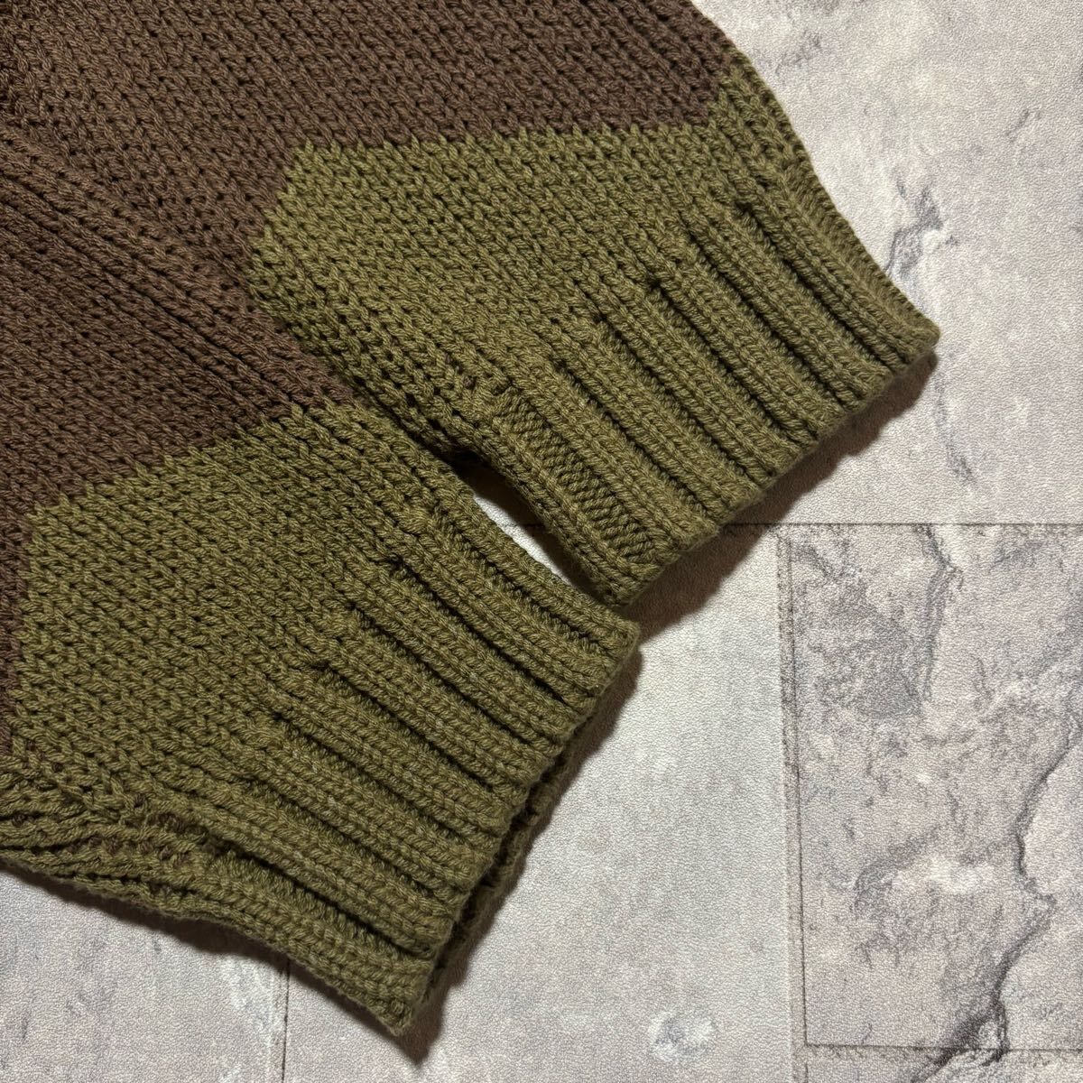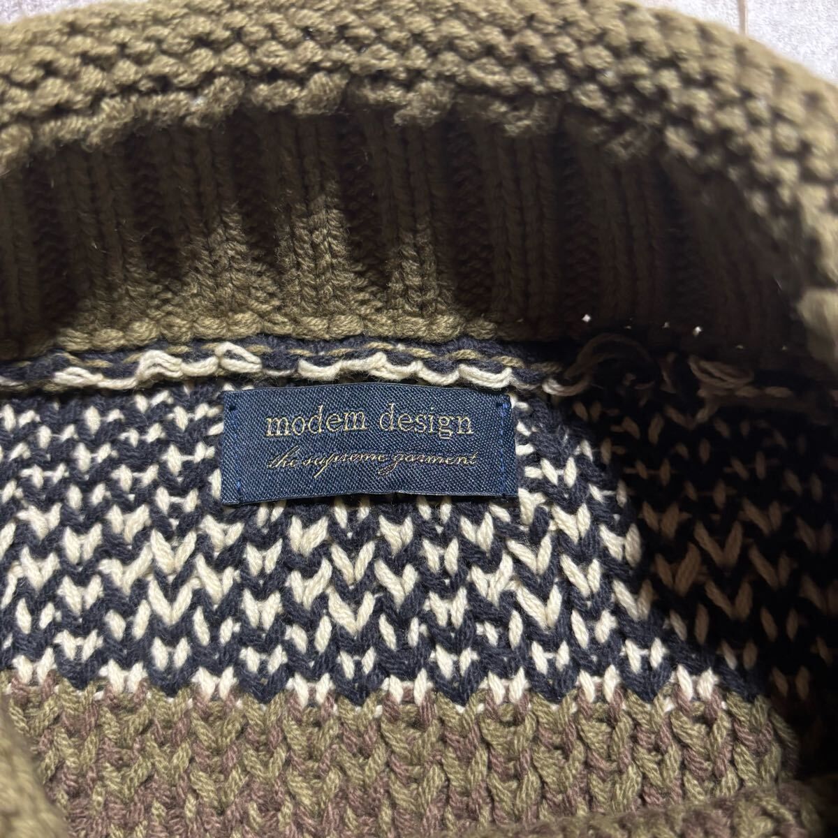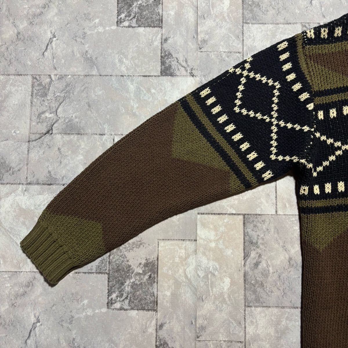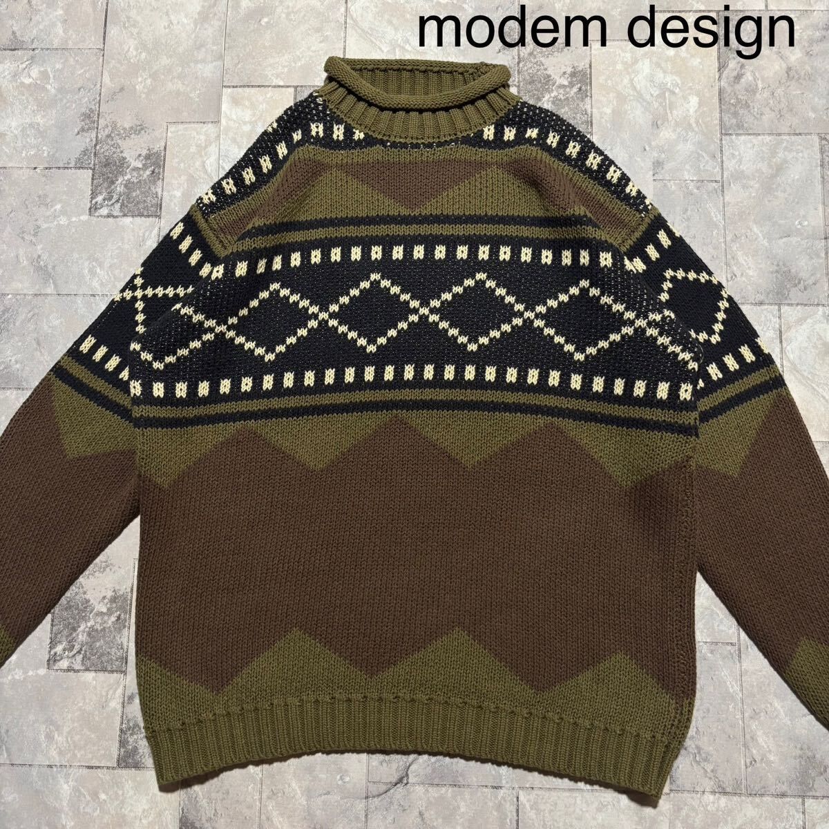 modem design モデムデザイン ニット セーター 長袖 ビッグシルエット 総柄 幾何学 カーキ サイズ2XL相当 玉FS1765