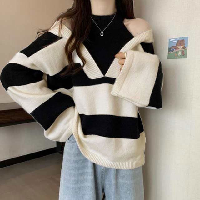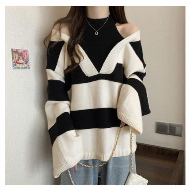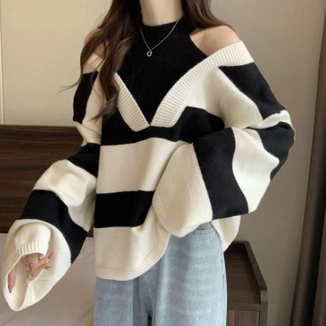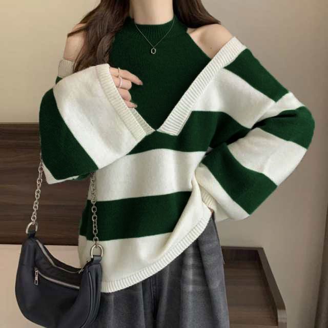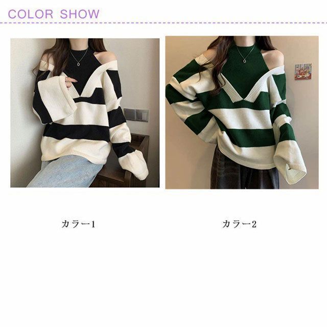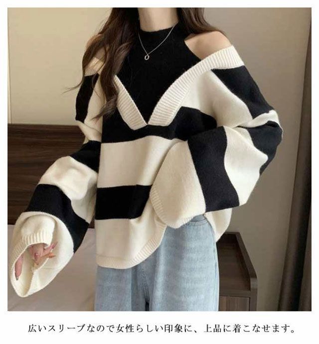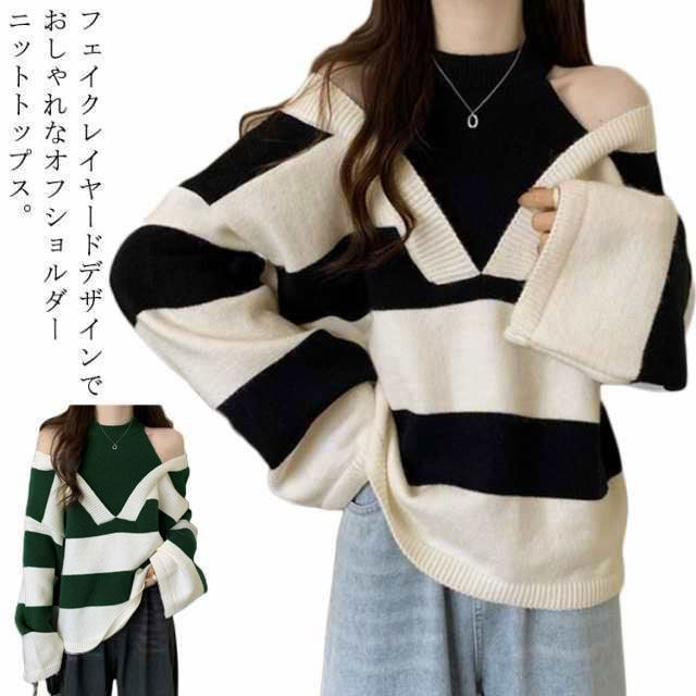 フェイクレイヤードデザインでおしゃれなオフショルダーニットトップス。