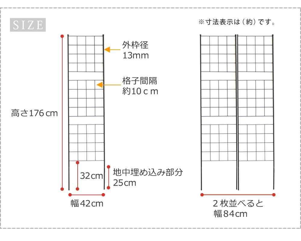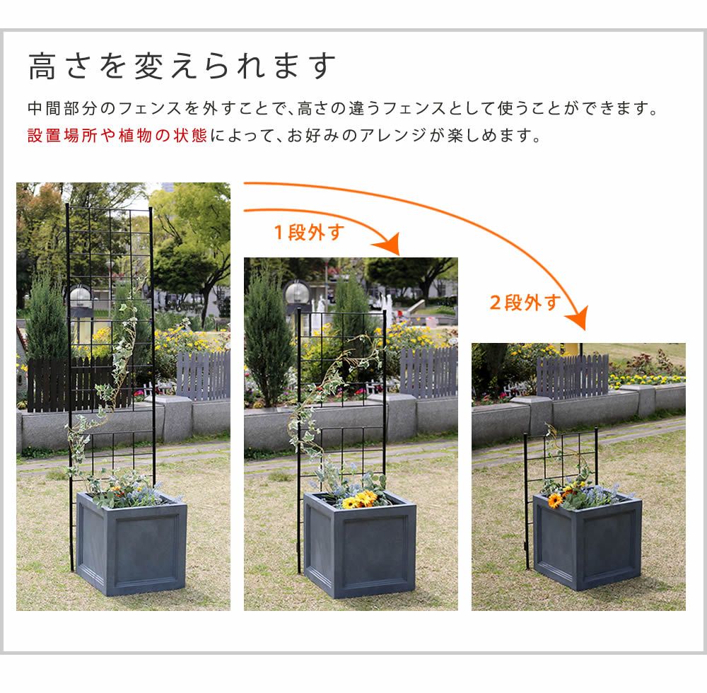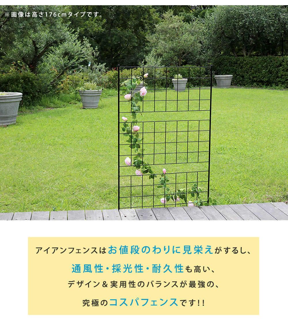 地面に挿すだけ!モダンで優雅なワンランク上の庭づくりシンプルで無駄を省き、使いやすさを追求した格子のフェンスは、洗練されたスタイリッシュさも、クラシカルで優美な雰囲気も感じられます。シンプルモダン、イングリッシュガーデン、フレンチ、ナチュラルetc...、どんなテイストの空間も引き立てて、場所を問わず活躍します。見通しのいいアイアンフェンスは、お庭の開放感を維持できるうえに、木製のものより経年劣化が少ないのがポイント。スリムタイプはトレリスとして使うこともでき、プランターの背面に立てて、薔薇を誘引すると素敵です。狭いベランダや玄関前でも窮屈にならず、クリスマスイルミネーションや、ハロウインデコレーションなど、家族のイベントを盛り上げます。 ■商品名
