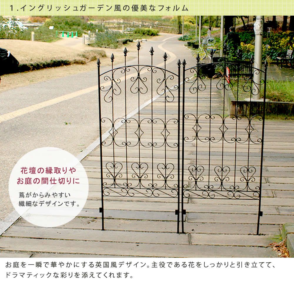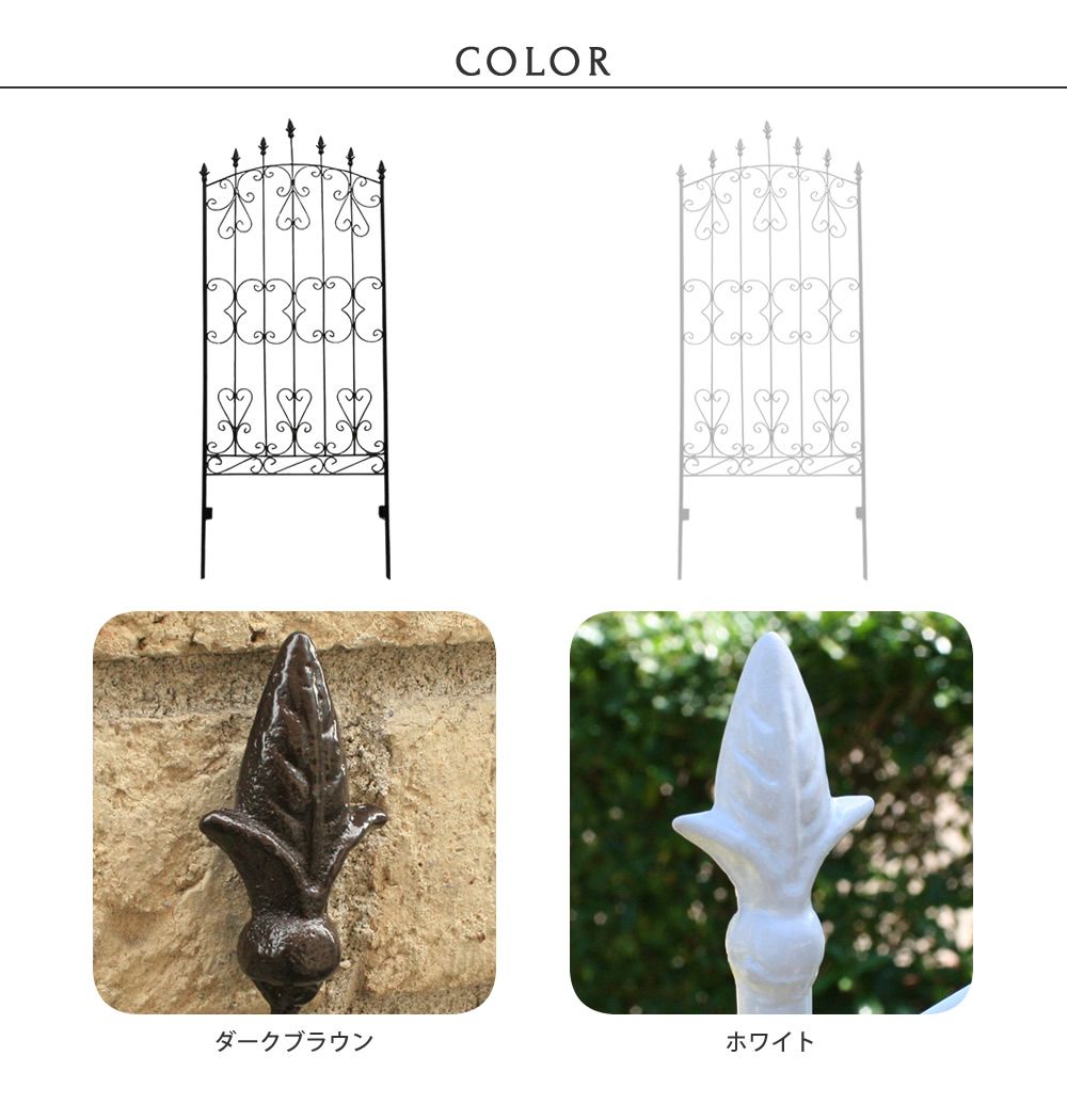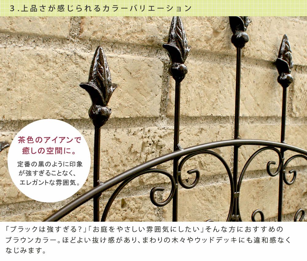 アンティークな曲線美が美しい英国風のアイアンフェンス薔薇をからませるのにピッタリ!エレガントな雰囲気のアイアンフェンスです。硬質な印象のアイアンの中ではめずらしく、やわらかなブラウンカラーの塗装と、薔薇のツタ&薔薇のつぼみのデザインが施され、上品で華やかなイメージ。壁に立てかけるだけで瀟洒(しょうしゃ)な存在感があり、蔦をからませればまるで、ロマンチックな古城の庭!オフシーズンでもお庭を華やかにしてくれます。薔薇とはもちろんベストマッチで、美しさをより引き立てます。ゴーヤやキュウリでグリーンカーテンを楽しんでも◎。高さ150cmのロータイプは、隣家との境界線に使うと、視線を遮りすぎることなく毎朝のご挨拶もできます。やんわりと目隠ししながらも、風通しが良く、軽やかでオシャレ。見るたびに幸せな気持ちになれるフェンスです。 ■商品名/型番アイアンローズフェンス150 ロータイプ 2枚組 ■カラー ダークブラウン…IFROSE-150-2Pホワイト…廃番 ■サイズ(約) 本体:幅 620×奥行 15×高さ 1510mm(1枚) ※地中埋め込み部分:250mm ■重量(約) 3.4kg(1枚) ■材質 スチール ■仕上げ 粉体塗装 ■付属品 ・結束バンド 3本 ・埋め込み金具 4本 ■組立区分 組立品 ■組立目安時間 2人で20分 ■備考 基本的に埋め込み部分をしっかり埋め込んで頂ければ自立しますが、柔らかすぎる地面などでは倒れる恐れがありますので、お客様自身で固定いただくか、ご使用をお避けください。 ※北海道・沖縄・離島は別途送料が必要となります。 アイアンフェンスシリーズ一覧 ■アイアンフェンスロー150 2枚組 DNF150-2P ■アイアンローズフェンス150 2枚組 IFROSE-150-2P ■アイアンフェンス120(2枚組) YBIF-120-2P ■アイアンフェンスロー150 4枚組 DNF150-4P ■アイアンローズフェンス150 4枚組 IFROSE-150-4P ■アイアンフェンス120(4枚組) YBIF-120-4P ■アイアンフェンスロー220 2枚組 DNF220-2P ■アイアンローズフェンス220 2枚組 IFROSE-220-2P ■アイアンフェンス220(2枚組) YBIF-220-2P ■アイアンフェンスロー220 4枚組 DNF220-4P ■アイアンローズフェンス220 4枚組 IFROSE-220-4P ■アイアンフェンス220(4枚組) YBIF-220-4P