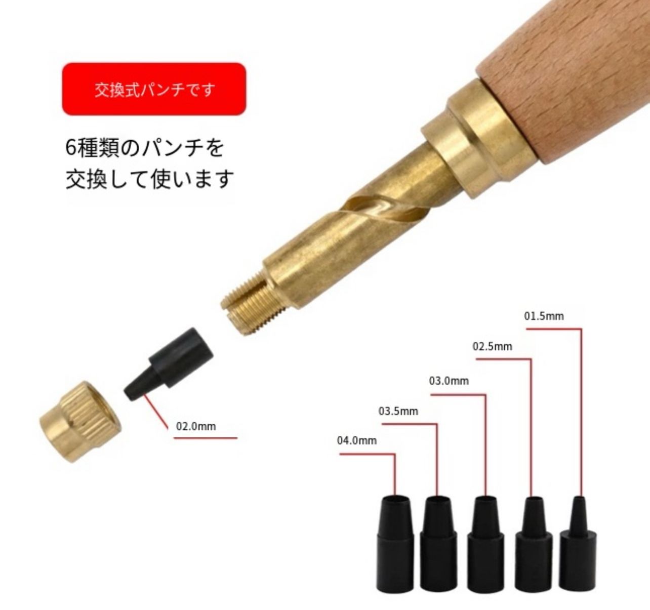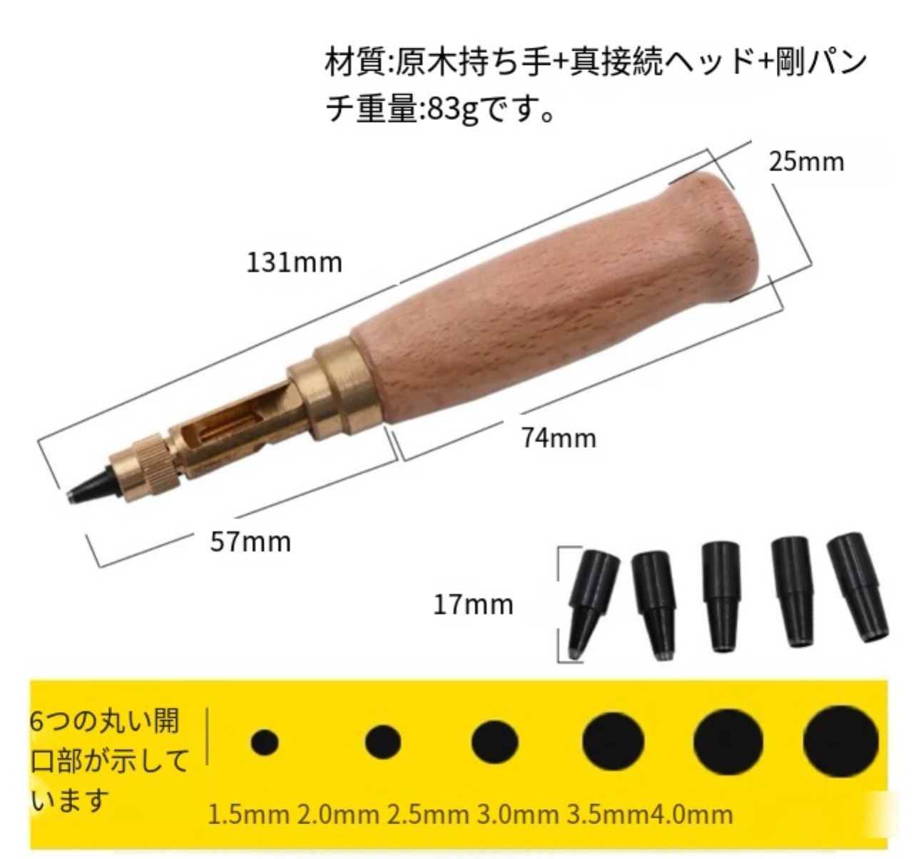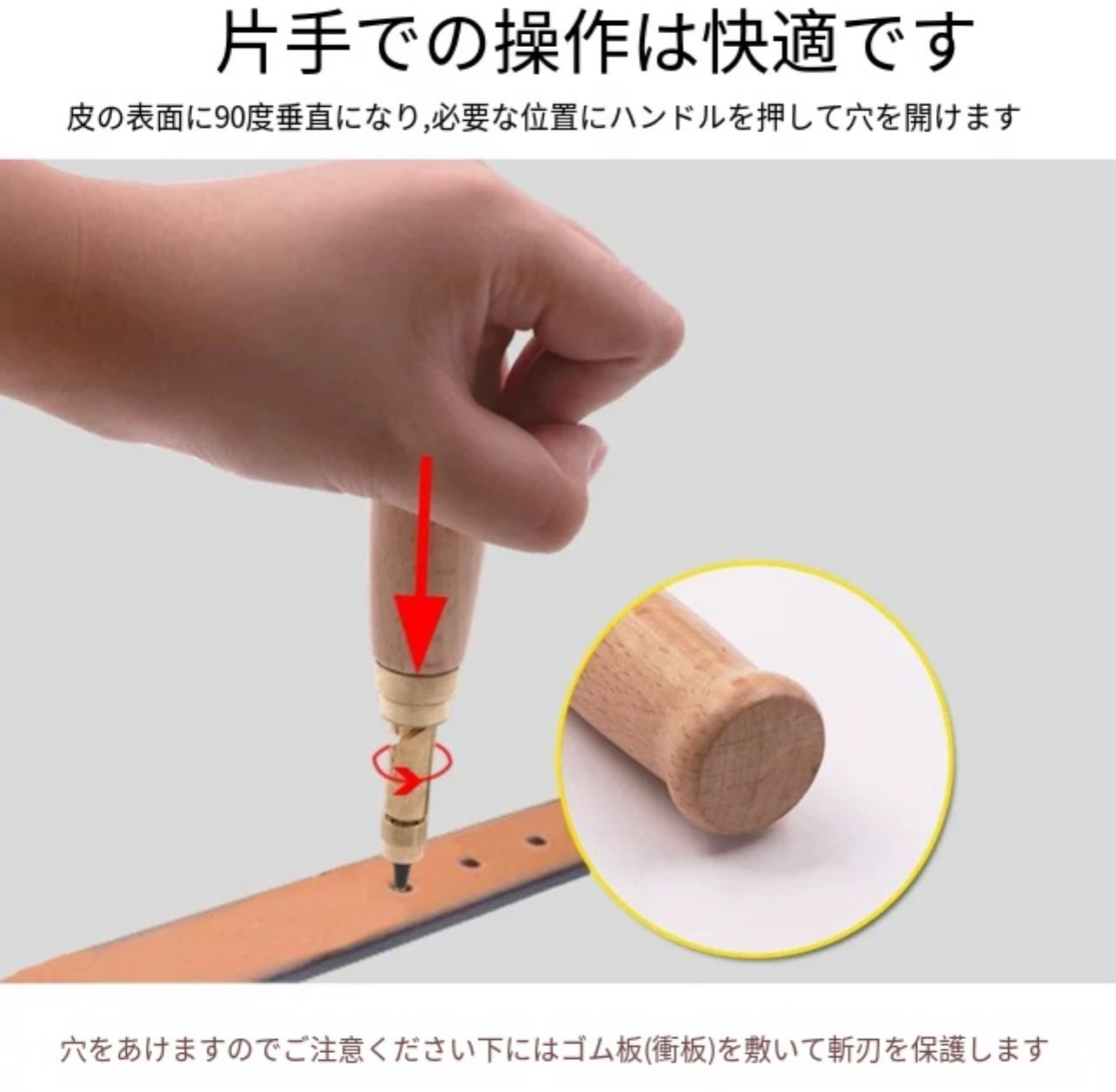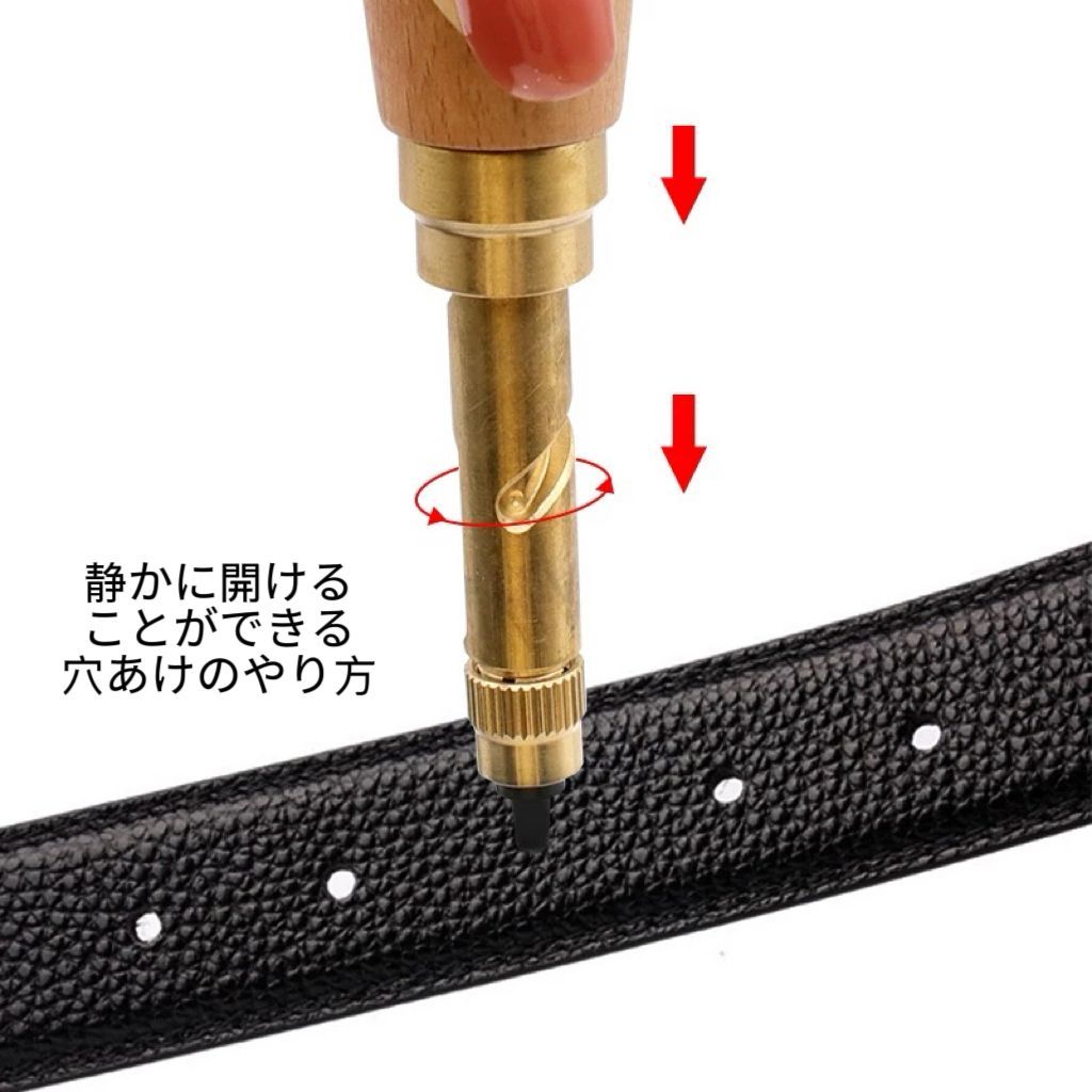 【スクリュー式穴開けパンチ】 握りやすいデザイン、温かみのある無垢材、回転式で静かに打音なく開けられる便利で安心な穴あけパンチです。 ベルトを穴開ける時に、力があまり使わなく、女性でも気楽に使用できる便利グッズです。 【押すと回るスクリュー】 穴をあけたい場所に当てて、上からおさえるとスクリュー式に回転して穴をあけられる仕組みとなっています。上からハンマーでたたいたりするものと違い静かに開けることができ、環境を気にせず使用できます。穴寸法は6種類あります。6つの丸型穴(1.5mm、2mm、2.5mm、3mm、3.5mm、4mm)です。 【使用範囲が幅広い】 革パン革製品、布製品、紙、ベルト、レザークラフト、時計ストラップ、ダンボール、ゴム、ビニール、プラスチック、裁縫、靴、バッグ、鞄、キャンバス、洋服、ギフトカード、ゴム板、段ボールカード、硬質PVCや裁縫に大活躍です。家庭でも工場でも事務室でも適用です。(ものによっては開けにくいものもございますので、ご了承ください。) ※日本語取扱説明書、撮影用小物類などは付属しておりません。 ※簡易包装でのお届けとなります。 ※モニターにより色合いが若干違いが生じる場合がございます。 ※デザインは入荷時期により若干変化する場合がございます ※海外製造品のため、多少の匂い軽微な傷や汚れ、個体差等ある場合がございます。 ※商品の使用により生じた如何なる損害・被害も弊社では一切の 責任を負いかねますので予めご了承ください。 ※発送方法について:お届け先、個数によって配送情報に記載の配送業者とは異なる場合がございます。日本郵便、佐川急便、またはセイノーエクスプレス(大型商品)でお届けいたします。なお、配送業者はお選びいただけませんので、ご了承ください。