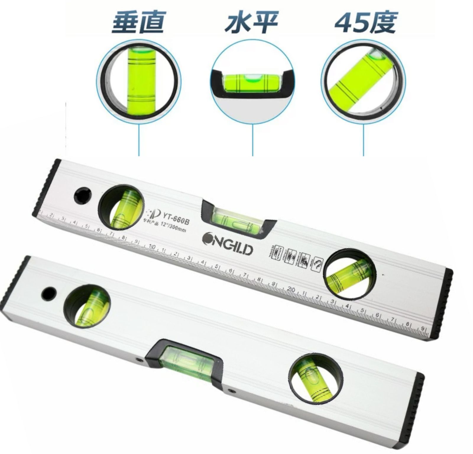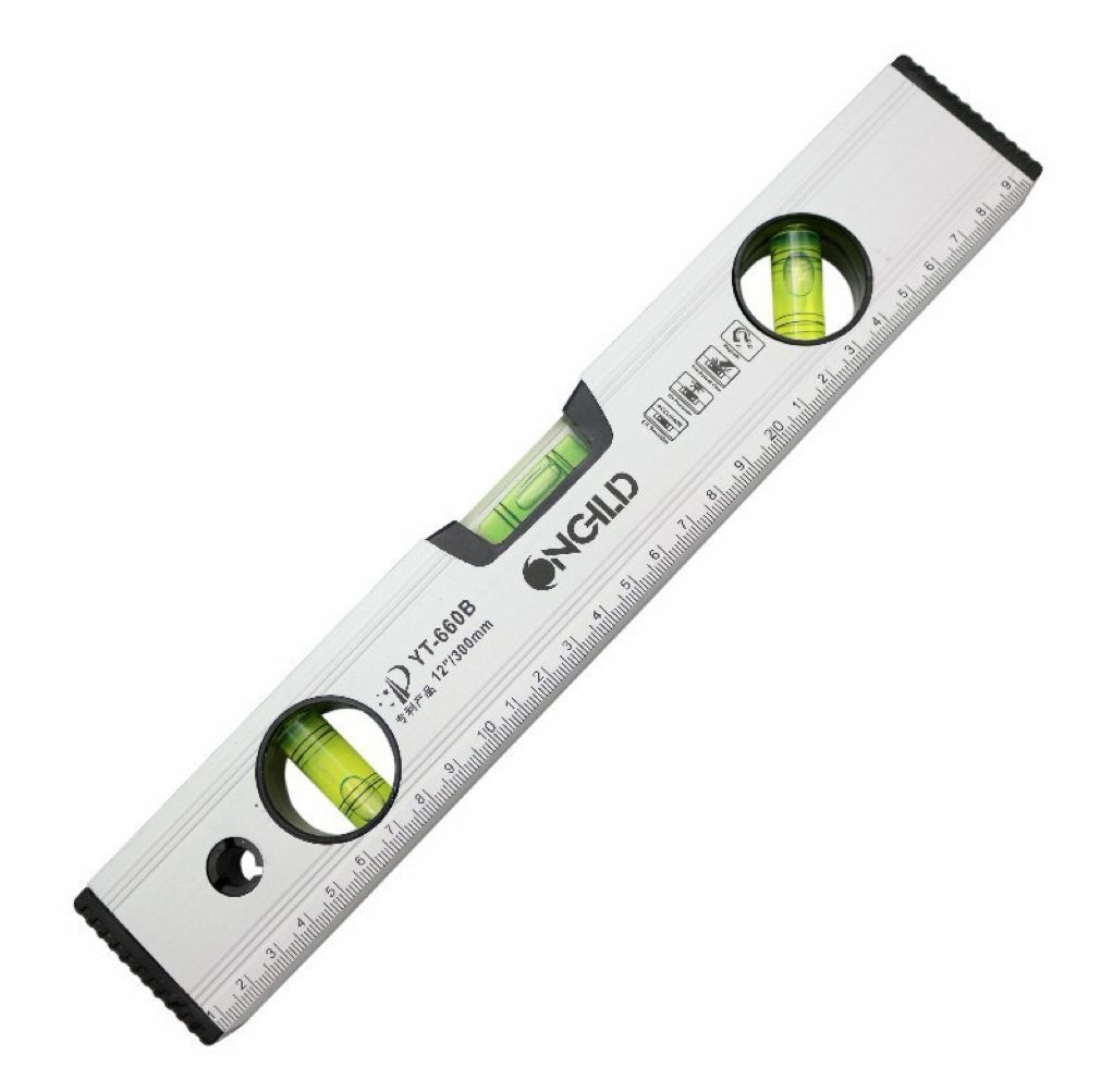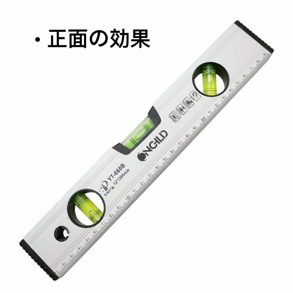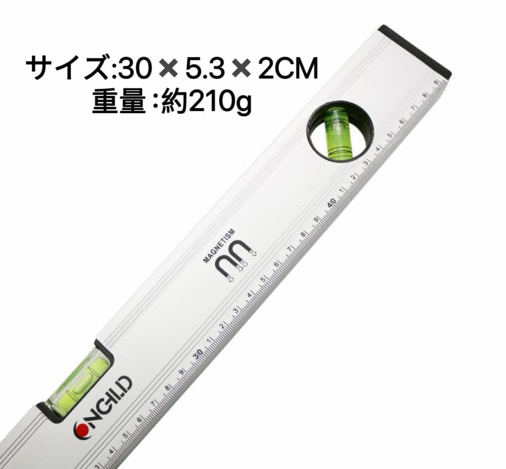 【 水平器 】 水平器は棚の取り付けや、レンガやブロックなどを積む際に地面に対して水平になっているかを確認するための道具です。水平ではない棚は危ないですし、レンガも途中で傾いて積むと見栄えが悪いだけでなく、修復の際も非常に面倒なことになります。そのため、水平器は「精度」が非常に重要です。本製品は耐久性の強いアルミ製を採用しているため、温度の影響受けにくい仕様となっております。また、そのほかにも変形しない・寿命が長いことが特徴となっております。 【 3方向の角度計測に対応! 】 一般的な水平器は、「水平と垂直」の2方向のみ計測できるタイプが多いですが、本製品は、地面に対する角度を「水平・垂直・斜め45度」の3方向で計測可能なモデルとなっております。3方向計測できることで、幅広い箇所に対応しており、その結果、作業効率が良くなります。 【マグネット付き】裏面にはマグネット加工を施しておりますので、手で抑えなくても柱などに貼り付けて使用することができます。両手が使える状態でらくらく作業することが可能です。 【 DIYなどでも大活躍】 DIY中に、「まっすぐなっているかな?」と心配しながら作業していませんでしょうか?近年DIYブームの中、ご自身で棚やキャビネットを作製する方も多いです。正確に作製するためにおすすめのアイテムが水平器です。特に一人DIYの場合は、水平を確認する作業がとても大変です。水平・垂直をきちんと出しておかないと、できあがりに大きく影響します。水平器は置くだけで、精密に水平・垂直を教えてくれます。 【 水平器の使用・保管の際の注意 】 〇「大きい衝撃をあたえない」 落下や物にぶつけるなど大きな衝撃を水平器に与えると、気泡管が割れる原因になります。また、気泡位置のゼロ点に狂いが生じるため、本体の故障にもつながります。使用中や保管の際は極力衝撃をあたえないようにしましょう。 〇「気泡位置を確認する」 水平器を利用する前は、平らな所に水平器を置き180度反転させても気泡位置に差がないかを確認してから使用するようにしましょう。気泡位置に差がある場合は作業をする前に気泡位置の調節が必要です。 〇「測定面の取り扱い」 測定面に傷や汚れがあると、製品の精度が落ち正確に測定することができなくなります。測定をするときは測定するところの埃などを取り払い測定面に傷がつかないように