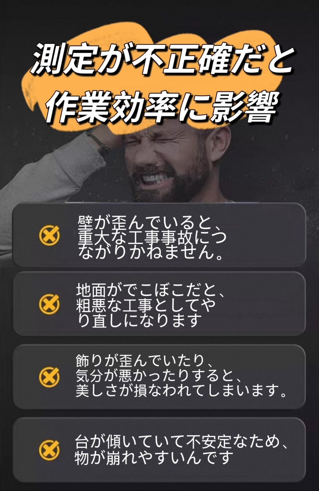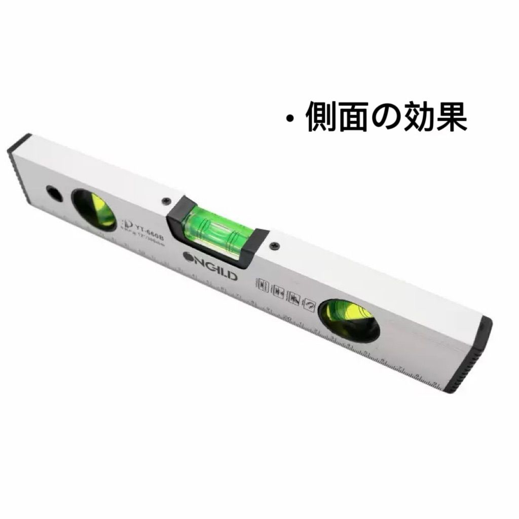【 水平器 】 水平器は棚の取り付けや、レンガやブロックなどを積む際に地面に対して水平になっているかを確認するための道具です。水平ではない棚は危ないですし、レンガも途中で傾いて積むと見栄えが悪いだけでなく、修復の際も非常に面倒なことになります。そのため、水平器は「精度」が非常に重要です。本製品は耐久性の強いアルミ製を採用しているため、温度の影響受けにくい仕様となっております。また、そのほかにも変形しない・寿命が長いことが特徴となっております。 【 3方向の角度計測に対応! 】 一般的な水平器は、「水平と垂直」の2方向のみ計測できるタイプが多いですが、本製品は、地面に対する角度を「水平・垂直・斜め45度」の3方向で計測可能なモデルとなっております。3方向計測できることで、幅広い箇所に対応しており、その結果、作業効率が良くなります。 【マグネット付き】裏面にはマグネット加工を施しておりますので、手で抑えなくても柱などに貼り付けて使用することができます。両手が使える状態でらくらく作業することが可能です。 【 DIYなどでも大活躍】 DIY中に、「まっすぐなっているかな?」と心配しながら作業していませんでしょうか?近年DIYブームの中、ご自身で棚やキャビネットを作製する方も多いです。正確に作製するためにおすすめのアイテムが水平器です。特に一人DIYの場合は、水平を確認する作業がとても大変です。水平・垂直をきちんと出しておかないと、できあがりに大きく影響します。水平器は置くだけで、精密に水平・垂直を教えてくれます。 【 水平器の使用・保管の際の注意 】 〇「大きい衝撃をあたえない」 落下や物にぶつけるなど大きな衝撃を水平器に与えると、気泡管が割れる原因になります。また、気泡位置のゼロ点に狂いが生じるため、本体の故障にもつながります。使用中や保管の際は極力衝撃をあたえないようにしましょう。 〇「気泡位置を確認する」 水平器を利用する前は、平らな所に水平器を置き180度反転させても気泡位置に差がないかを確認してから使用するようにしましょう。気泡位置に差がある場合は作業をする前に気泡位置の調節が必要です。 〇「測定面の取り扱い」 測定面に傷や汚れがあると、製品の精度が落ち正確に測定することができなくなります。測定をするときは測定するところの埃などを取り払い測定面に傷がつかないように