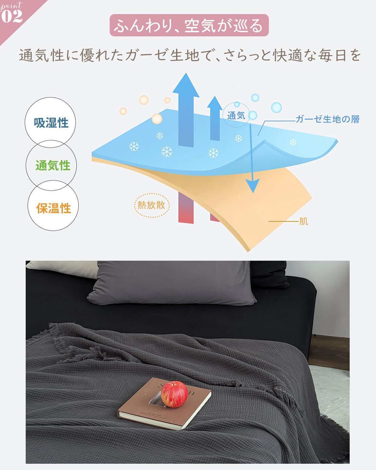 【極上の通気性&吸湿性】ガーゼは通常の織物と比べて織り目が粗く、空気の通り道が多いため、熱や湿気がこもりにくい構造になっています。特に四重ガーゼのような多層構造の生地は、空気の層を作りながらも風を通しやすく、夏場の蒸し暑い夜でも涼しく快適に過ごせます。