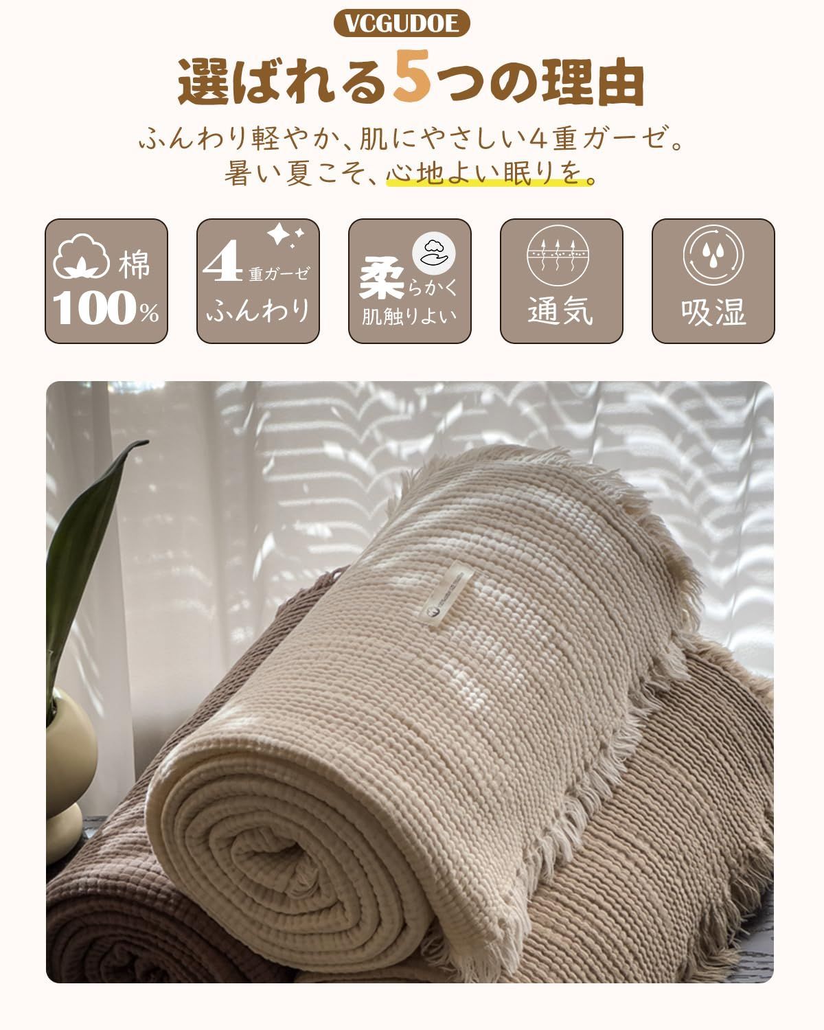 【厳選された天然コットン100%使用】VCGUDOEのガーゼケットは化学繊維を一切使用せず、コットン本来のやわらかさと温もりをそのまま活かしています。ふわふわな肌触りは、まるでタオルケットやバスタオルを超える心地よさ。敏感肌の方や赤ちゃんにも安心してご使用いただけます。