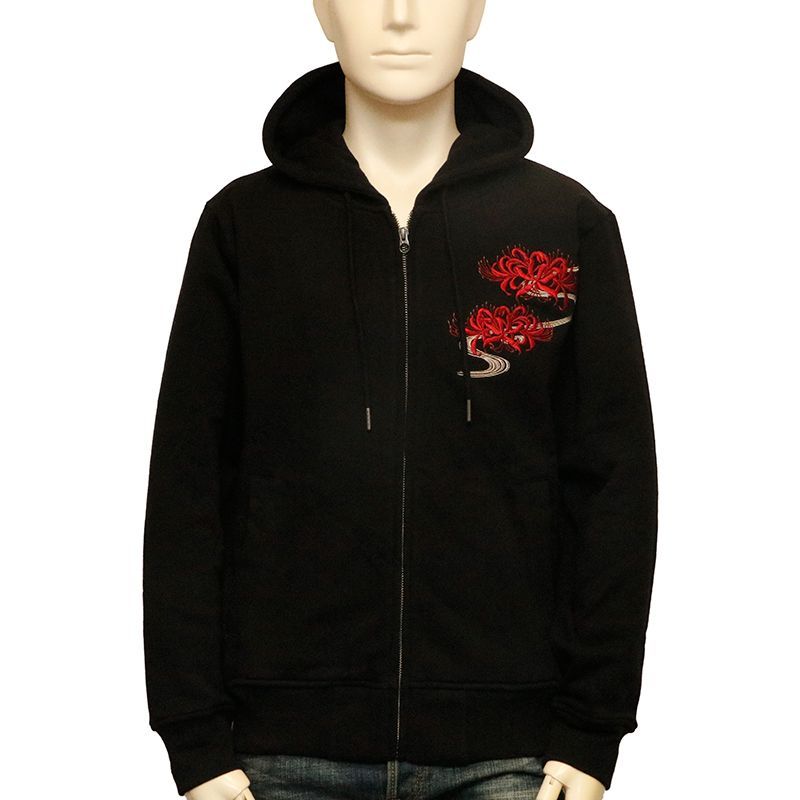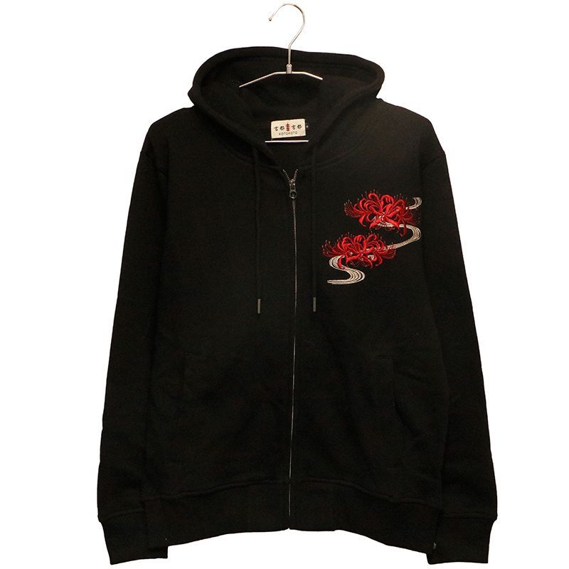 フロントは左胸に流水と彼岸花を組み合わせ刺繍で配置。
