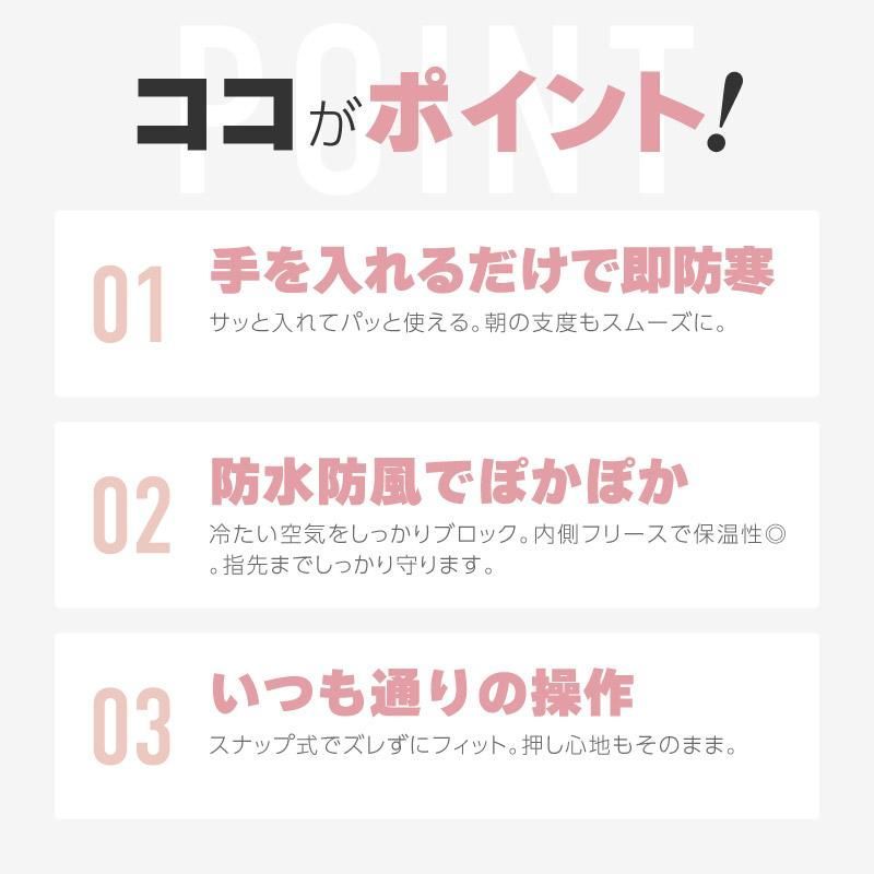 肉厚の生地が隙間を作らず、風の侵入を防ぐ設計で手元からしっかり保温。