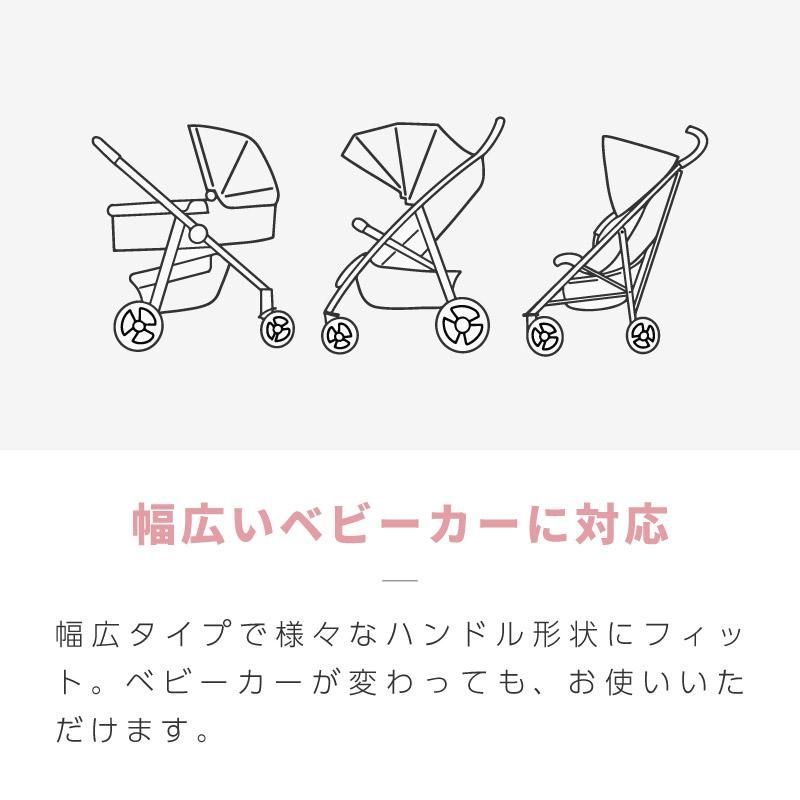 幅広タイプで様々なハンドル形状にフィット。ベビーカーが変わっても、お使いいただけます。