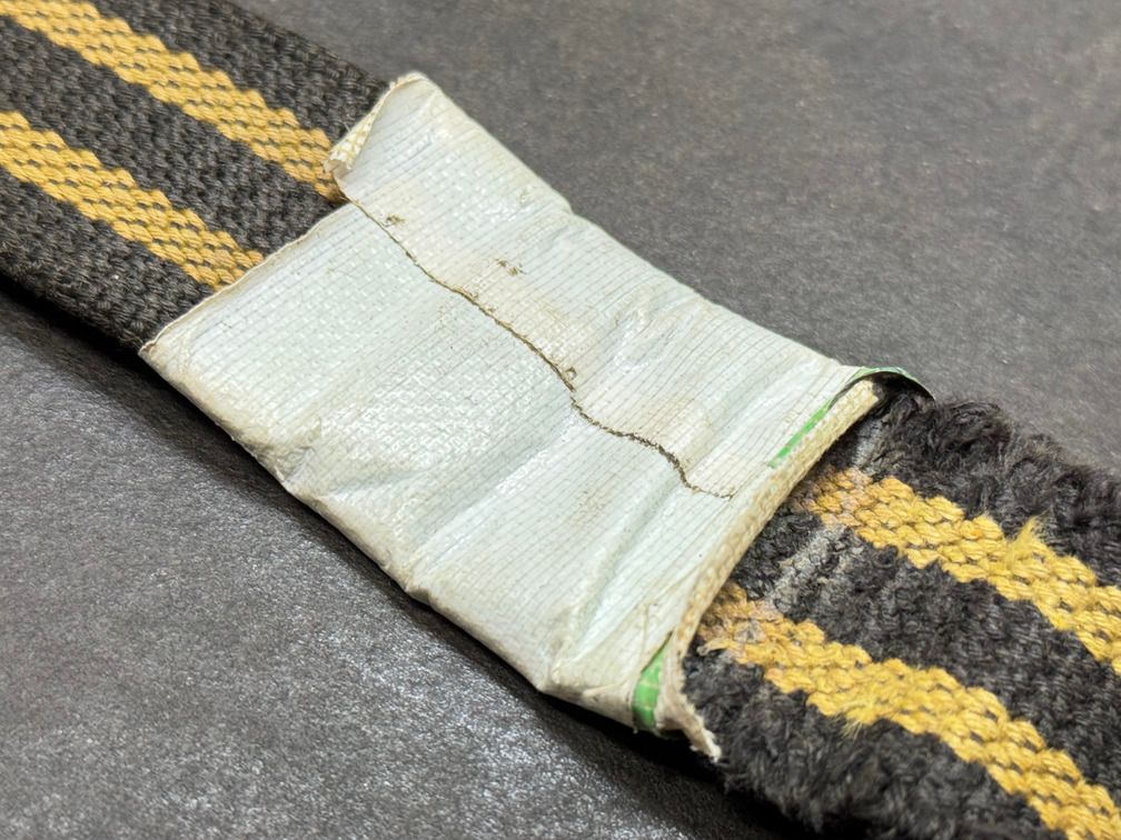 また、ベルト部分が破損しているため、現在はガムテープで固定された状態になっています。
