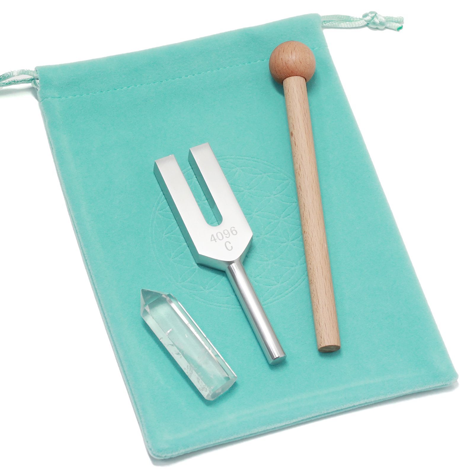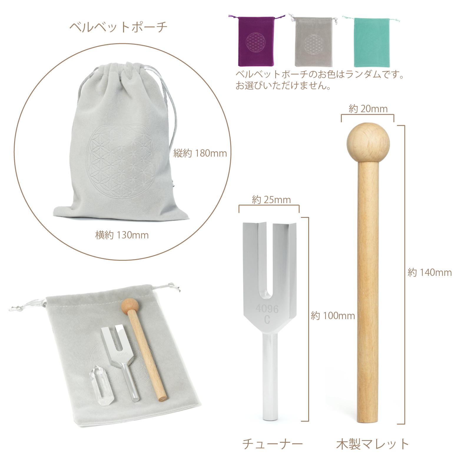 全長100mm。持ちやすさを考慮した設計で、木製マレットで軽く叩けば、澄みきった4096Hzの美しい響きが広がります。この周波数は「天使の音色」とも呼ばれ、浄化やリラクゼーション、瞑想に最適です。