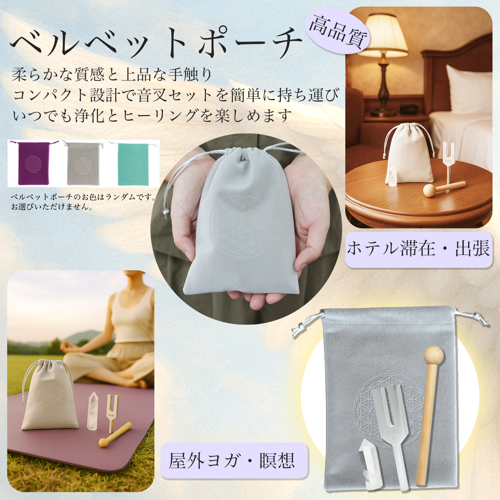 持ち運びや収納に便利な専用ポーチ付き。ホテルやヨガ、旅行など外出先でも音叉と水晶を手軽に持ち歩き、日常に浄化と癒しをプラスできます。